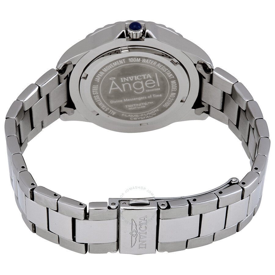 Stainless steel case with a stainless steel bracelet. Fixed stainless steel bezel. White mother of pearl dial with luminous silver-tone hands and index hour markers. Minute markers around the outer rim. Dial Type: Analog. Luminescent hands and markers. Three multi-function sub-dials displaying: date, day of the week and 24-hour. Caliber VH68 quartz movement. Scratch resistant flame fusion crystal. Pull / push crown. Solid case back. Round case shape. Case size: 38 mm. Case thickness: 11 mm. Band width: 18 mm. Band length: 7 inches. Fold over clasp with a push button release. Water resistant at 100 meters / 330 feet. Functions: date, day, GMT, second time zone, hour, minute, second. Casual watch style. Watch label: Japan Movt. Invicta Angel Quartz White Mother of Pearl Dial Ladies Watch 29106.