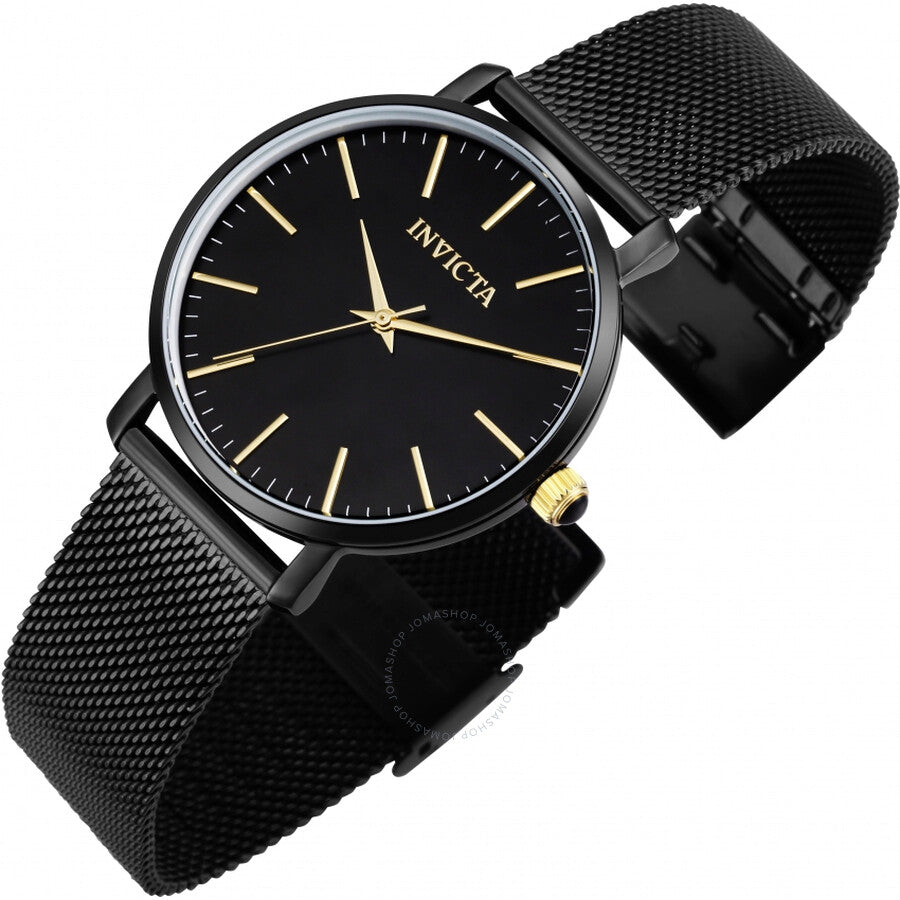 Black stainless steel case with a black stainless steel mesh bracelet. Fixed gold-tone stainless steel bezel. Black dial with gold-tone hands and index hour markers. Dial Type: Analog. TMI Caliber PC21J quartz movement. Scratch resistant Flame Fusion crystal. Pull / push crown. Solid case back. Round case shape, case size: 38 mm, case thickness: 9 mm. Band width: 18 mm, band length: 7 inches. Hook buckle clasp. Water resistant at 50 meters / 165 feet. Functions: hour, minute, second. Angel Series. Casual watch style. Watch label: Japan Movt. Invicta Angel Quartz Black Dial Ladies Watch 39371.