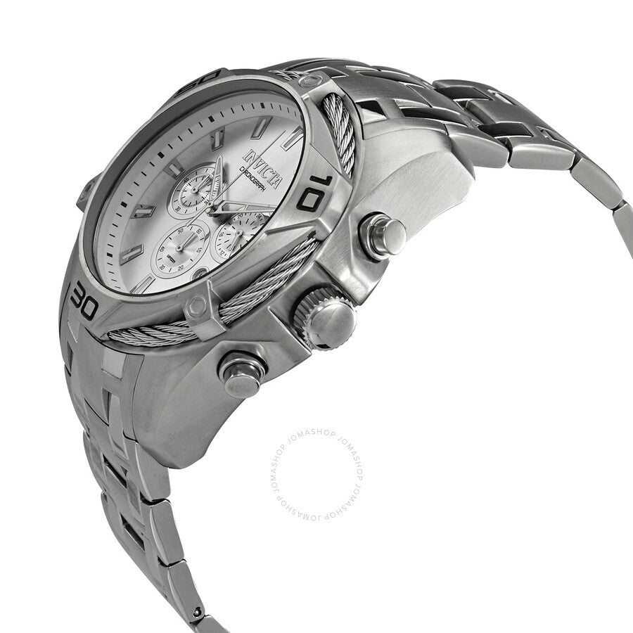 Stainless steel case with a stainless steel bracelet. Fixed stainless steel bezel with silver-tone cable wire trim. Silver dial with silver-tone hands and index hour markers. Minute markers around the outer rim. Dial Type: Analog. Luminescent hands and markers. Date display between the 4 and 5 o'clock positions. Chronograph - three sub-dials displaying: 60 second, 60 minute and 24 hour. Hattori caliber VD53 quartz movement. Scratch resistant Flame Fusion crystal. Pull / push crown. Solid case back. Triangle case shape. Case size: 50 mm. Band width: 26 mm. Band length: 7.25 inches. Fold over clasp. Water resistant at 100 meters / 330 feet. Functions: chronograph, date, GMT, second time zone, hour, minute, second. Bolt Series. Sport watch style. Watch label: Japan Movt. Invicta Bolt Chronograph Quartz Silver Dial Men's Watch 34117.