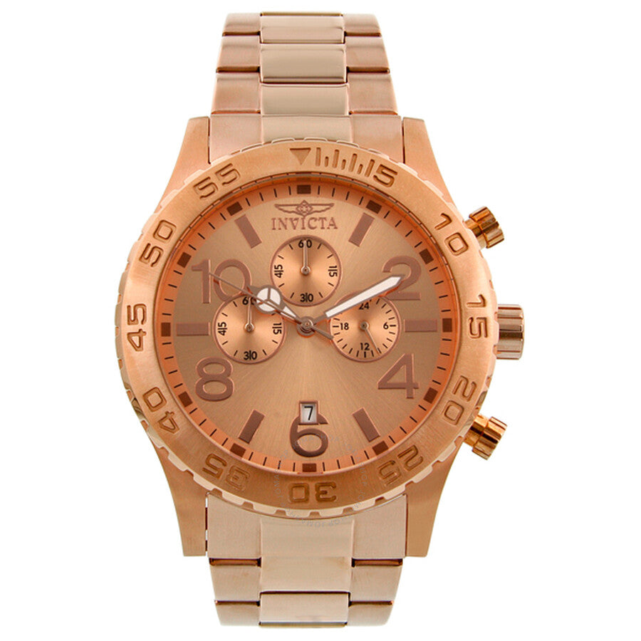 Rose gold-tone stainless steel caseand bracelet. Unidirectional rose gold-tone bezel. Rose dial with luminous rose gold-tone hands and alternating Arabic numeral and index hour markers. Minute markers around the outer rim. Dial Type: Analog. Luminescent hands. Date display appears at the 6 o'clock position. Chronograph - three sub-dials displaying: 60 second, 60 minute and 24 hour. Quartz movement. Scratch resistant flame fusion crystal. Pull / push crown. Solid case back. Case diameter: 50 mm. Case thickness: 13 mm. Round case shape. Band width: 26 mm. Band length: 8.25 inches. Deployment clasp with a safety release. Water resistant at 50 meters/ 165 feet. Functions: hours, minutes, seconds, chronograph, calendar. Sport watch style. Invicta Elegant Ocean Chronograph Rose Dial Rose Gold-tone Men's Watch 1271.