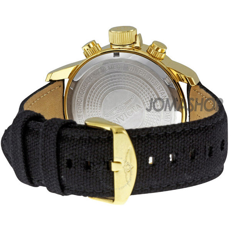 Gold-tone stainless steel case with a black canvas (leather backed) strap. Fixed gold-tone bezel. Blue dial with luminous silver-tone hands and Arabic numeral hour markers. Minute markers. Tachymeter around the outer rim. Dial Type: Analog. Luminescent hands and markers. Date display at 4 o'clock position. Chronograph - three sub-dials displaying: 60 minutes, 60 seconds and 1/10 seconds. Quartz movement. Scratch resistant flame fusion crystal. Screw down crown. Solid case back. Case diameter: 46mm. Case thickness: 12mm. Band width: 21 mm. Tang clasp. Water resistant at 100 meters / 330 feet. Functions: chronograph, date, tachymeter, hour, minute, second. Casual watch style. Invicta Lefty Force Chronograph Men's Watch 1516.