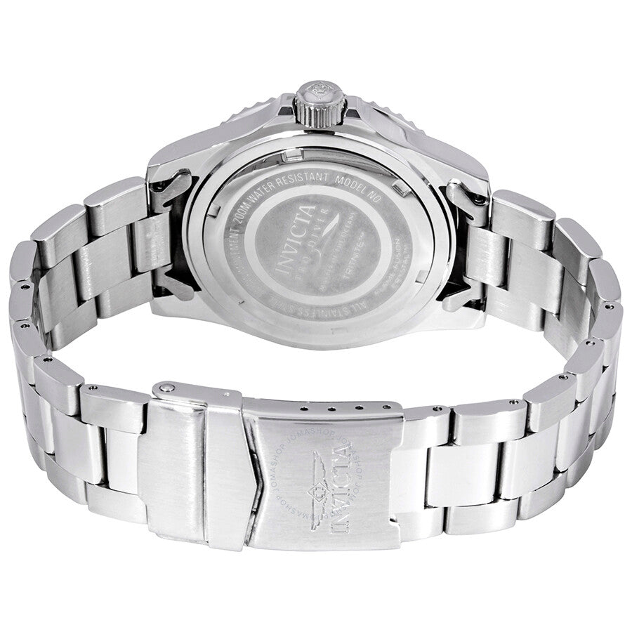 Stainless steel case with a stainless steel bracelet. Uni-directional rotating stainless steel bezel with a blue aluminium top ring. Blue dial with luminous silver-tone hands and dot hour markers. Minute markers around the outer rim. Dial Type: Analog. Luminescent hands and markers. Date display at the 3 o'clock position. Hattori caliber PC32 quartz movement. Scratch resistant flame fusion crystal. Pull / push crown. Solid case back. Round case shape. Case size: 40 mm. Case thickness: 12.5 mm. Band width: 20 mm. Fold over clasp. Water resistant at 200 meters / 660 feet. Functions: date, hour, minute, second. Casual watch style. Watch label: Japan Movt. Invicta Pro Diver Blue Dial Stainless Steel Men's 40 mm Watch 26971.