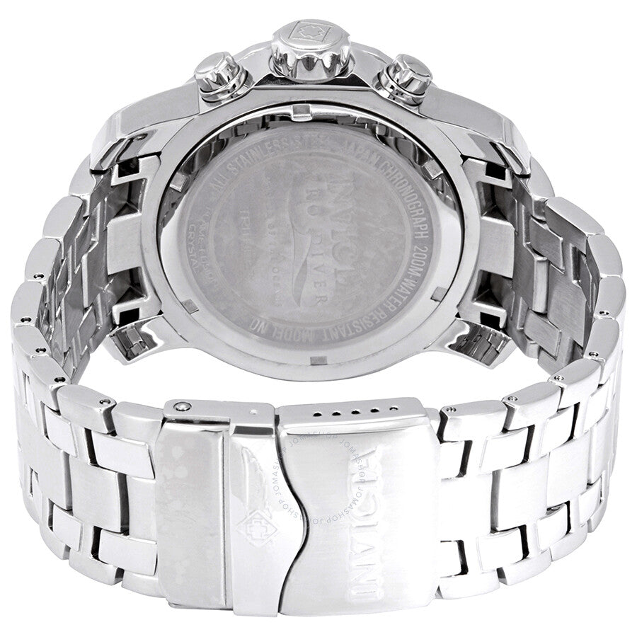 Stainless steel case with a stainless steel bracelet. Uni-directional rotating stainless steel bezel with a black ion-plated top ring. Black dial with silver-tone skeleton hands and dot hour markers. Minute markers around the outer rim. Dial Type: Analog. Luminescent hands and markers. Date display between the 4 and 5 o'clock positions. Chronograph - three sub-dials displaying: 60 second, 30 minute and 1/10th of a second. Ronda caliber 5030.D quartz movement. Scratch resistant flame fusion crystal. Pull / push crown. Solid case back. Round case shape. Case size: 48 mm. Case thickness: 16 mm. Band width: 26 mm. Band length: 9 inches. Deployment clasp. Water resistant at 200 meters / 660 feet. Functions: chronograph, date, hour, minute, second. Pro Diver Series. Sport watch style. Watch label: Swiss Movt. Invicta Pro Diver Chronograph Black Dial Men's Watch 0069.