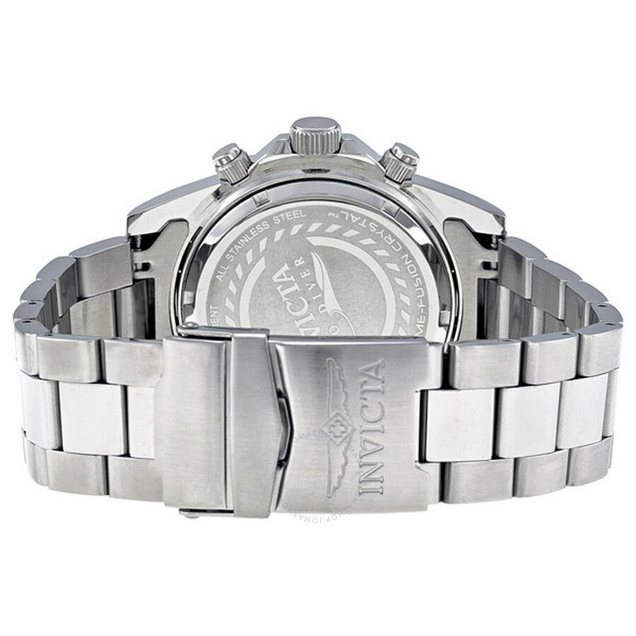 Stainless steel case with a stainless steel bracelet. Unidirectional stainless steel bracelet with black ion-plated top ring. Black dial with luminous hands and dot hour markers. Minute markers around the outer rim. Dial Type: Analog. Luminescent hands and markers. Chronograph - three sub-dials displaying: 60 second, 60 minute and 1/10 of a second. Swiss quartz movement. Scratch resistant flame fusion crystal. Push / pull crown. Solid case back. Case diameter: 44 mm. Case thickness: 12 mm. Band width: 22 mm. Fold over clasp with safety release. Water resistant at 200 meters / 660 feet. Invicta Pro Diver Chronograph Black Dial Men's Watch 1768.