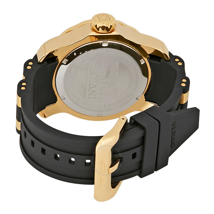 Yellow gold-tone stainless steel case with a black polyurethane strap with yellow gold-tone barrel inserts. Uni-directional rotating yellow gold-tone bezel with blue top ring. Blue dial with gold-tone skeleton hands and dot hour markers. 24 hour markers. Arabic numeral minute markers (at 5 minute intervals). Minute markers around the outer rim. Dial Type: Analog. Luminescent hands and markers. Date display at the 3 o'clock position. Ronda caliber 515.24H quartz movement. Scratch resistant flame fusion crystal. Pull / push crown. Solid case back. Case size: 48 mm. Case thickness: 17 mm. Round case shape. Band width: 26 mm. Tang clasp. Water resistant at 100 meters / 330 feet. Functions: date, GMT, second time zone, hour, minute, second. Sport watch style. Invicta Pro Diver GMT Blue Dial Men's Watch 6993.