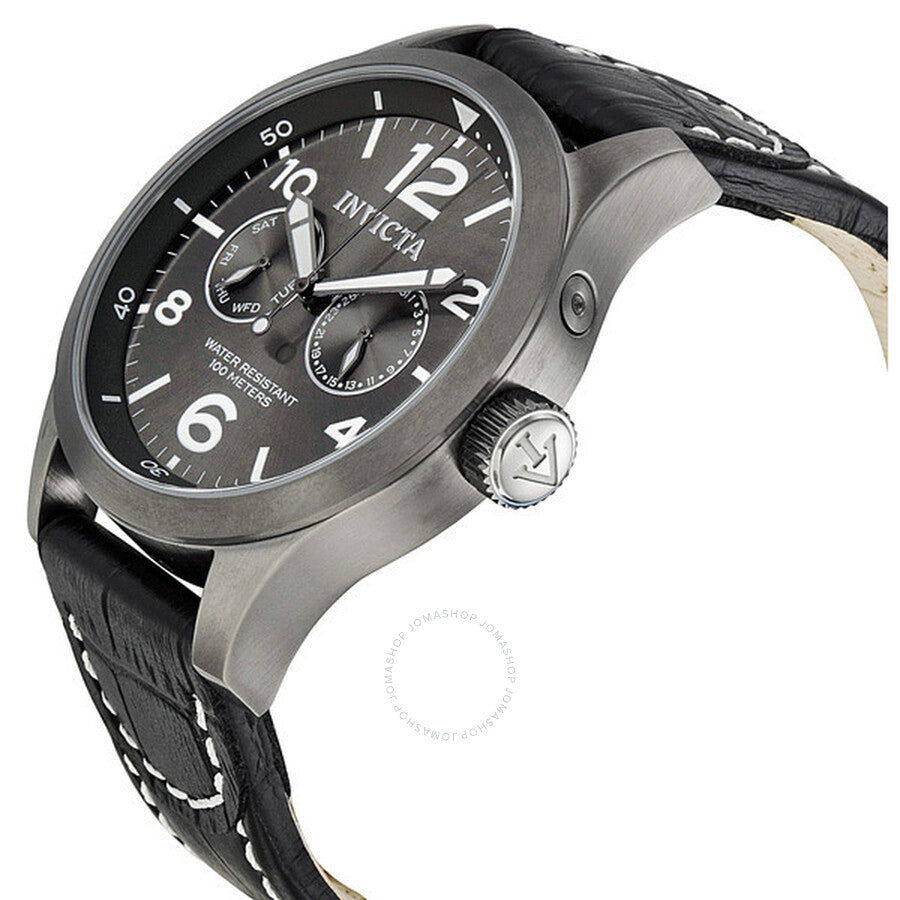 Gunmetal ion-plated stainless steel case with a black leather strap. Fixed gunmetal ion-plated bezel. Grey dial with luminous hands and alternating Arabic numeral and stick hour markers. Minute markers around the outer rim. Dial Type: Analog. Luminescent hands and markers. Two - date and day of the week subdials. ISA Caliber 9238D1 quartz movement. Scratch resistant flame fusion crystal. Pull / push crown. Solid case back. Round case shape, case size: 48 mm, case thickness: 13 mm. Band width: 24 mm, band length: 9.25 inches. Tang clasp. Water resistant at 100 meters / 330 feet. Functions: date, hour, minute, second, 24 hours. Specialty Military Series. Casual watch style. Invicta Specialty Military Grey Dial Black Leather Men's Watch 10492.