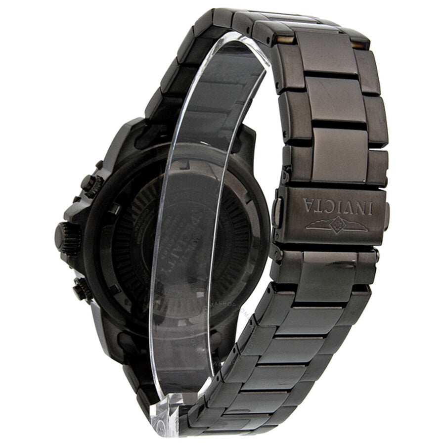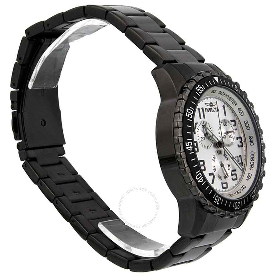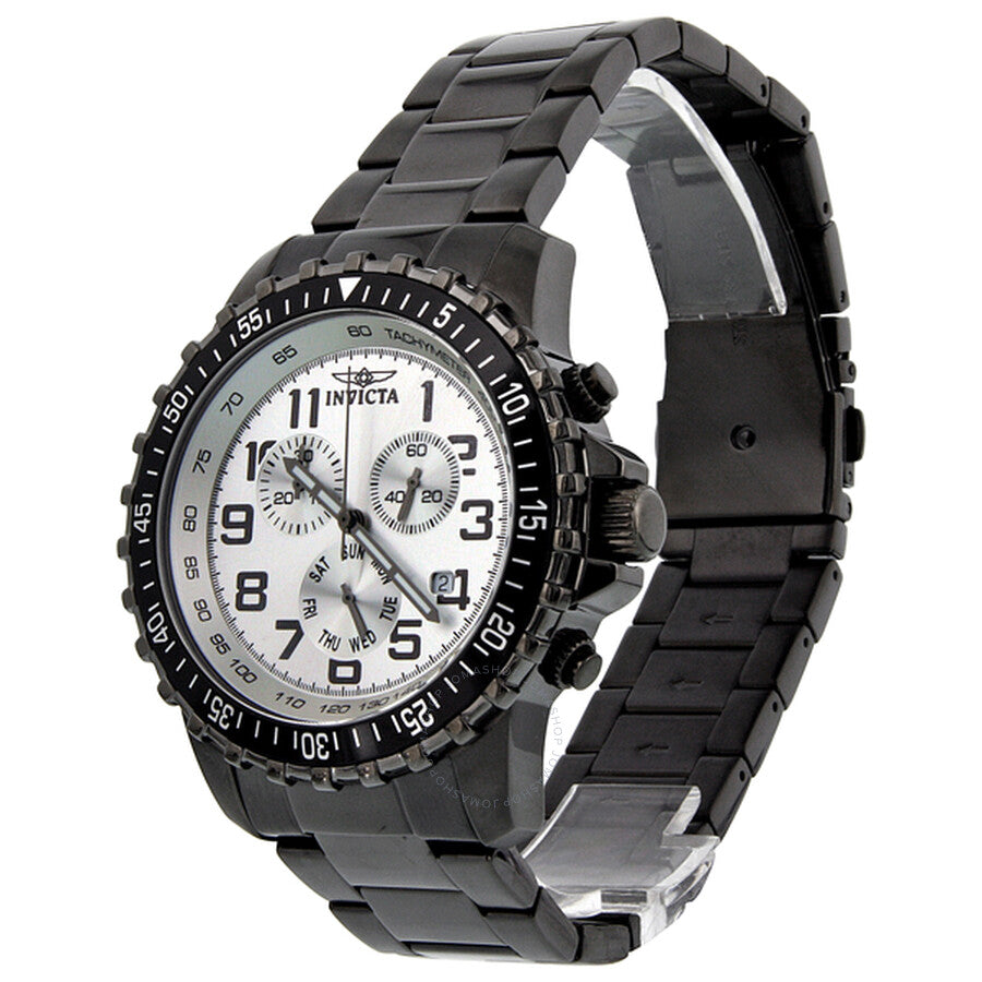 Gunmetal PVD stainless steel case and bracelet. Uni-directional rotating gunmetal PVD bezel with a black PVD top ring. Silver dial with luminous gunmetal hands and Arabic numeral hour markers. Minute markers. Tachymeter around the outer rim. Dial Type: Analog. Luminescent hands and markers. Date display at the 4 o'clock position. Chronograph - three sub-dials displaying: 60 second, 30 minute and day of the week. ISA Caliber 8172/220 quartz movement. Scratch resistant flame fusion crystal. Pull / push crown. Solid case back. Round case shape, case size: 45 mm, case thickness: 13 mm. Band width: 22 mm, band length: 9 inches. Deployment clasp with a push button release. Water resistant at 100 meters / 330 feet. Functions: chronograph, date, day, hour, minute, second. Casual watch style. Invicta Specialty Pilot Chronograph Silver Dial Men's Watch 11370.