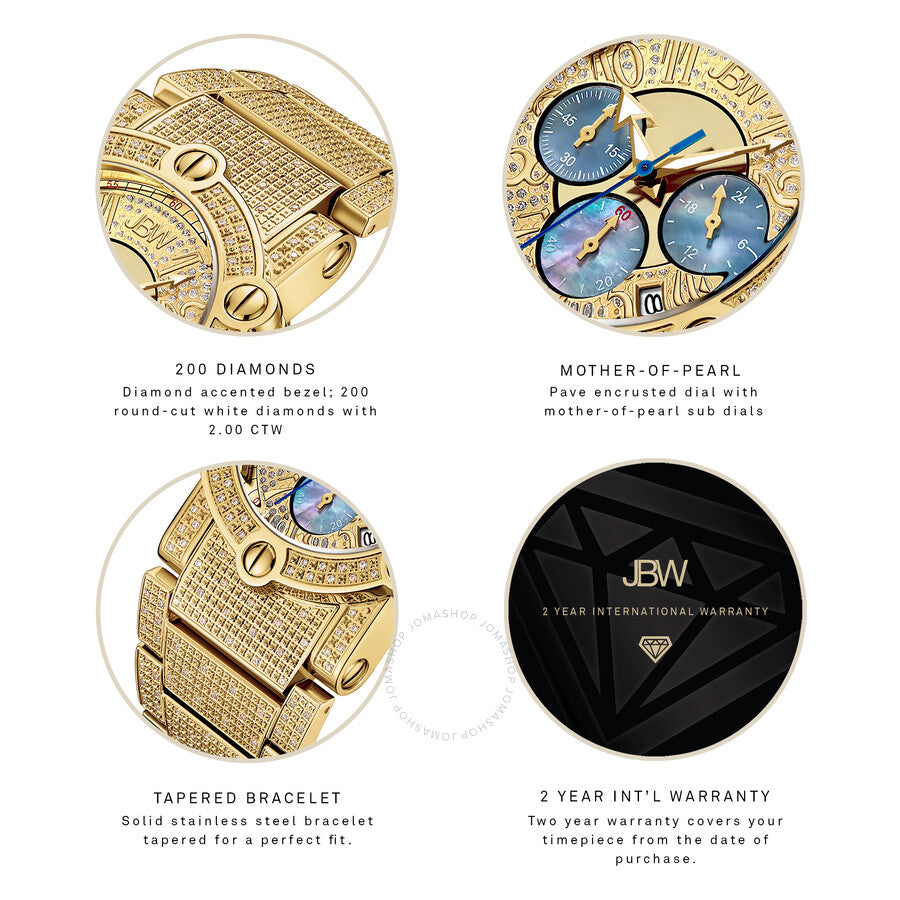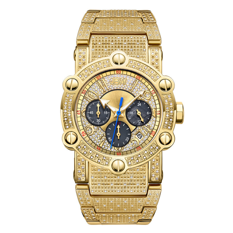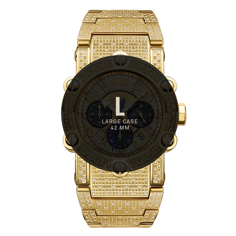 18kt gold-plated stainless steel case with a 18kt gold-plated stainless steel bracelet set with diamonds. Fixed 18kt gold-plated bezel set with diamonds. Gold (diamond-set) dial with luminous yellow gold-tone arrow-shaped hands and Arabic numeral hour markers. Arabic numeral minute markers (at 5 minute intervals). Minute markers around the outer rim. Dial Type: Analog. Luminescent hands. Date display between the 4 and 5 o'clock positions. Chronograph - three sub-dials displaying: 60 small second, 60 minute and 24 hour. Quartz movement. Scratch resistant mineral crystal. Solid case back. Round case shape. Case size: 42 mm. Case thickness: 14 mm. Band width: 32 mm. Band length: 8.5 inches. Fold over clasp with a double push button release. Water resistant at 50 meters / 165 feet. Functions: chronograph, date, hour, minute, second, dual time. Phantom Series. Luxury watch style. Watch label: Japan Movt. JBW Phantom Chronograph Quartz Diamond Men's Watch JB-6215-200-A.