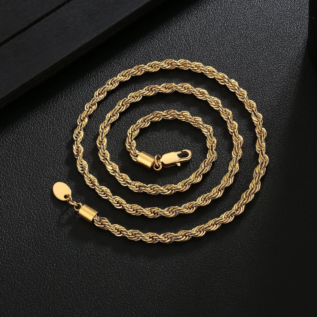 The Big Daddy 4mm Stainless Steel Rope Chain is coated with 14K gold, giving it a glossy and golden appearance. It comes with safety clasps and has fine craftsmanship, making it a stylish hip-hop jewellery item. It can be paired with various pendants or worn in different lengths as a set.