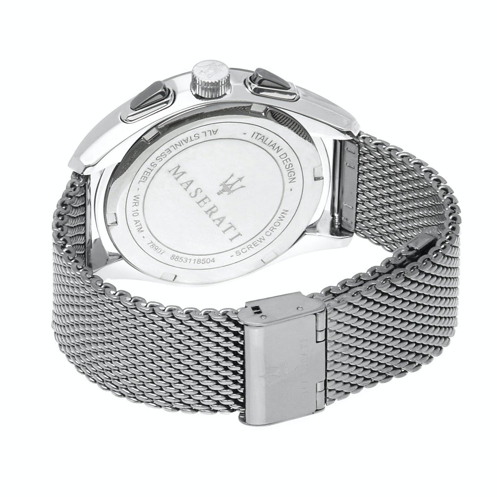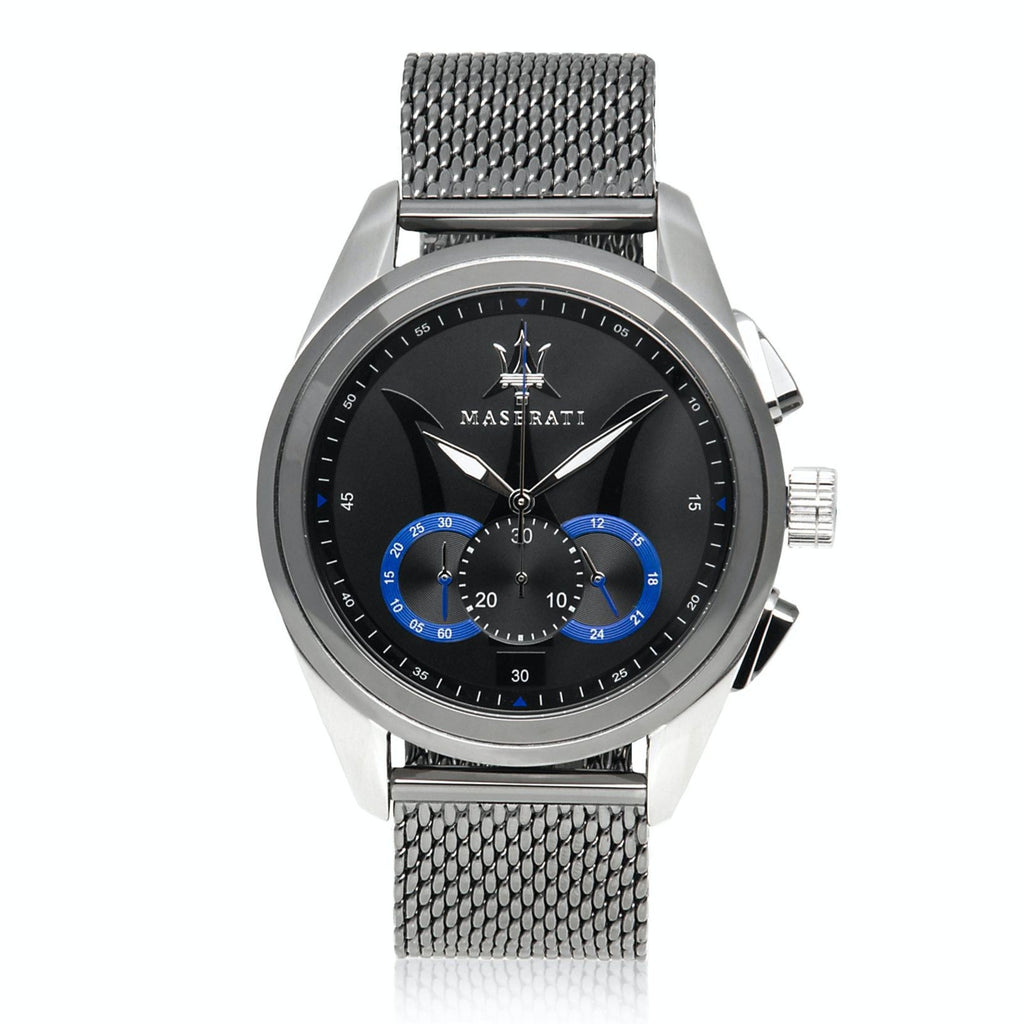 Stainless steel case with a gunmetal PVD stainless steel mesh bracelet. Fixed gunmetal PVD bezel. Black dial with luminous silver-tone hands. Minute markers around the outer rim. Dial Type: Analog. Luminescent hands. Chronograph - three sub-dials displaying: 60 second, 30 minute and 24 hour. Miyota Caliber JS50-00C quartz movement. Scratch resistant mineral crystal. Screw down crown. Solid case back. Round case shape. Case size: 45 mm. Case thickness: 12.7 mm. Band width: 22 mm. Fold over clasp. Water resistant at 100 meters / 330 feet. Functions: chronograph, hour, minute, second. Traguardo Series. Casual watch style. Watch label: Japan Movt. Maserati Traguardo Chronograph Black Dial Men's Watch R8873612006.