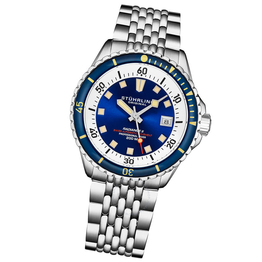 Men's Automatic Dive Watch with Swiss Movement, Stainless Steel Case, Blue Dial, blue bezel, Stainless Steel beaded bracelet Silver-tone stainless steel case and bracelet. Blue stainless steel bezel. Blue dial with silver-tone hands and index hour markers. Minute markers around the outer rim. Dial Type: Analog. Luminescent hands and markers. Date display at the 3 o'clock position. Automatic movement. Round case shape, case size: 46 mm, case thickness: 14.6 mm. Band width: 22 mm. Fold over clasp with a safety release. Functions: date, hour, minute, second. Additional Info: luminous hands, luminous markers, day of month. Depthmaster Series. Dress watch style. Stuhrling Original Depthmaster Automatic Blue Dial Men's Watch M18011.
