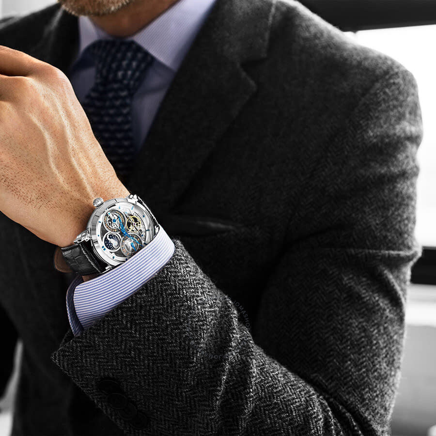 Stainless steel case with a black leather strap. Fixed stainless steel bezel. Silver (open heart) dial with blue dauphine-style hands and index hour markers. Dial Type: Analog. Two sub-dials displaying: am/pm indicator and 12 hour (dual time). Stuhrling Original calibre ST-91011 automatic movement, containing 22 Jewels, bitting at 21600 vph, and has a power reserve of approximately 60 hours. Scratch resistant mineral crystal. Pull / push crown. Transparent case back. Round case shape. Case size: 45 mm. Case thickness: 12.5 mm. Band length: 10 inches. Tang clasp. Water resistant at 50 meters / 165 feet. Functions: second time zone, hour, minute, second, day/night indicator. Legacy Series. Dress watch style. Stuhrling Original Legacy Automatic Silver Dial Men's Watch M13541.