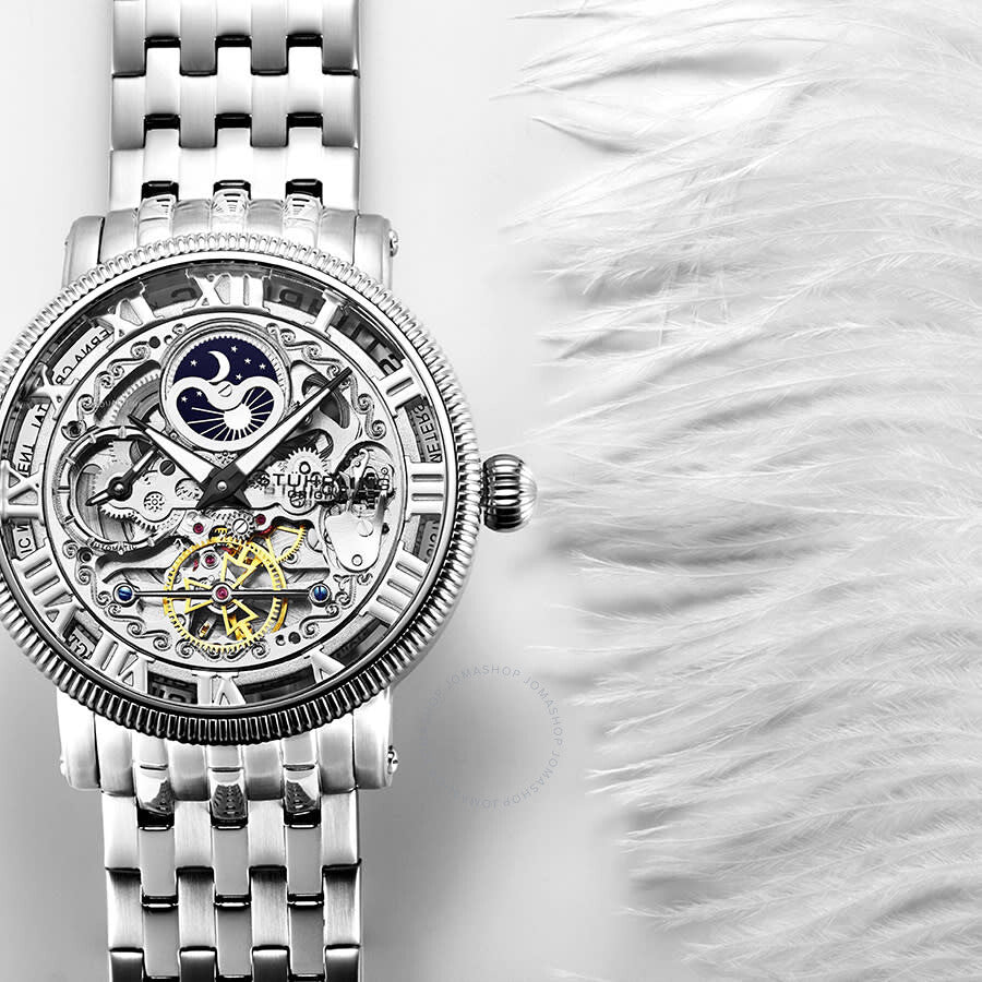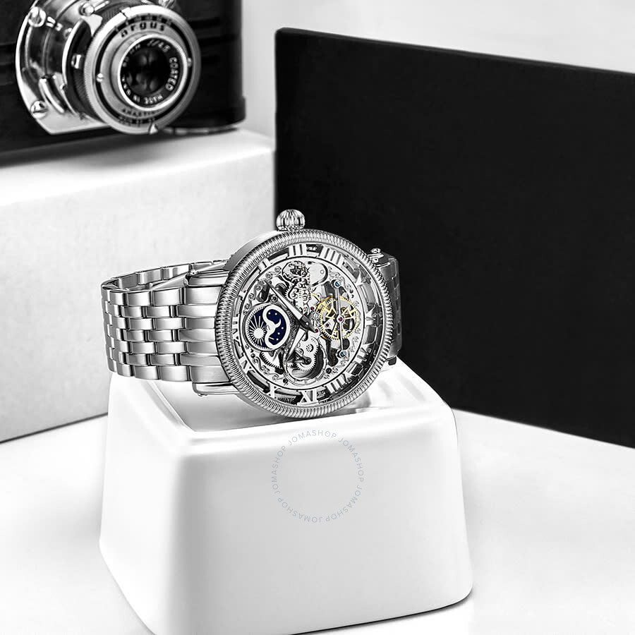 Silver-tone alloy case with a stainless steel bracelet. Fixed silver-tone alloy bezel. Silver skeleton dial with luminous black dauphine-style hands and Roman numeral hour markers. Dial Type: Analog. Luminescent hands. Two displays showing: am/pm indicator and dual time. Automatic movement. Scratch resistant mineral crystal. Pull / push crown. Transparent case back. Round case shape. Case size: 48.2 mm. Case thickness: 12.75 mm. Band width: 22 mm. Band length: 8.25 inches. Deployment clasp with a push button release. Water resistant at 50 meters / 165 feet. Functions: hour, minute, am/pm indicator, dual time. Dress watch style. Stuhrling Original Legacy Automatic Silver Dial Men's Watch M13573.