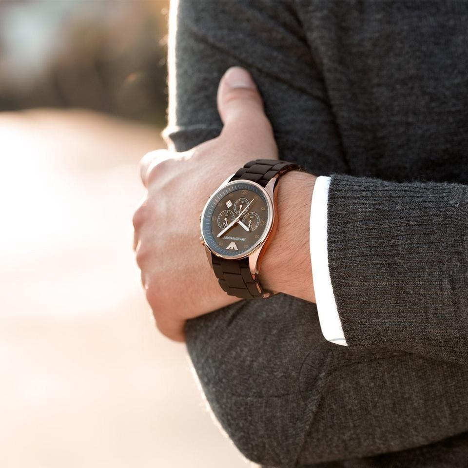 Rose gold-tone stainless steel case with a brown polyurethane-wrapped stainless steel bracelet. Fixed rose gold-tone bezel. Brown dial with luminous rose gold-tone hands and index hour markers. Arabic numeral minute markers (at 5 minute intervals). Minute markers around the outer rim. The Emporio Armani logo appears at the 12 o'clock position. Dial Type: Analog. Luminescent hands and markers. Date display between 4 and 5 o'clock positions. Chronograph - three sub-dials displaying: 60 second, 60 minute and 24 hour. Quartz movement. Scratch resistant mineral crystal. Screw down crown. Solid case back. Case diameter: 43 mm. Case thickness: 12 mm. Round case shape. Band width: 21 mm. Deployment clasp. Water resistant at 50 meters / 165 feet. Functions: chronograph, date, hour, minute, second. Casual watch style. Emporio Armani Sport Chronograph Brown Dial Men's Watch AR5890.