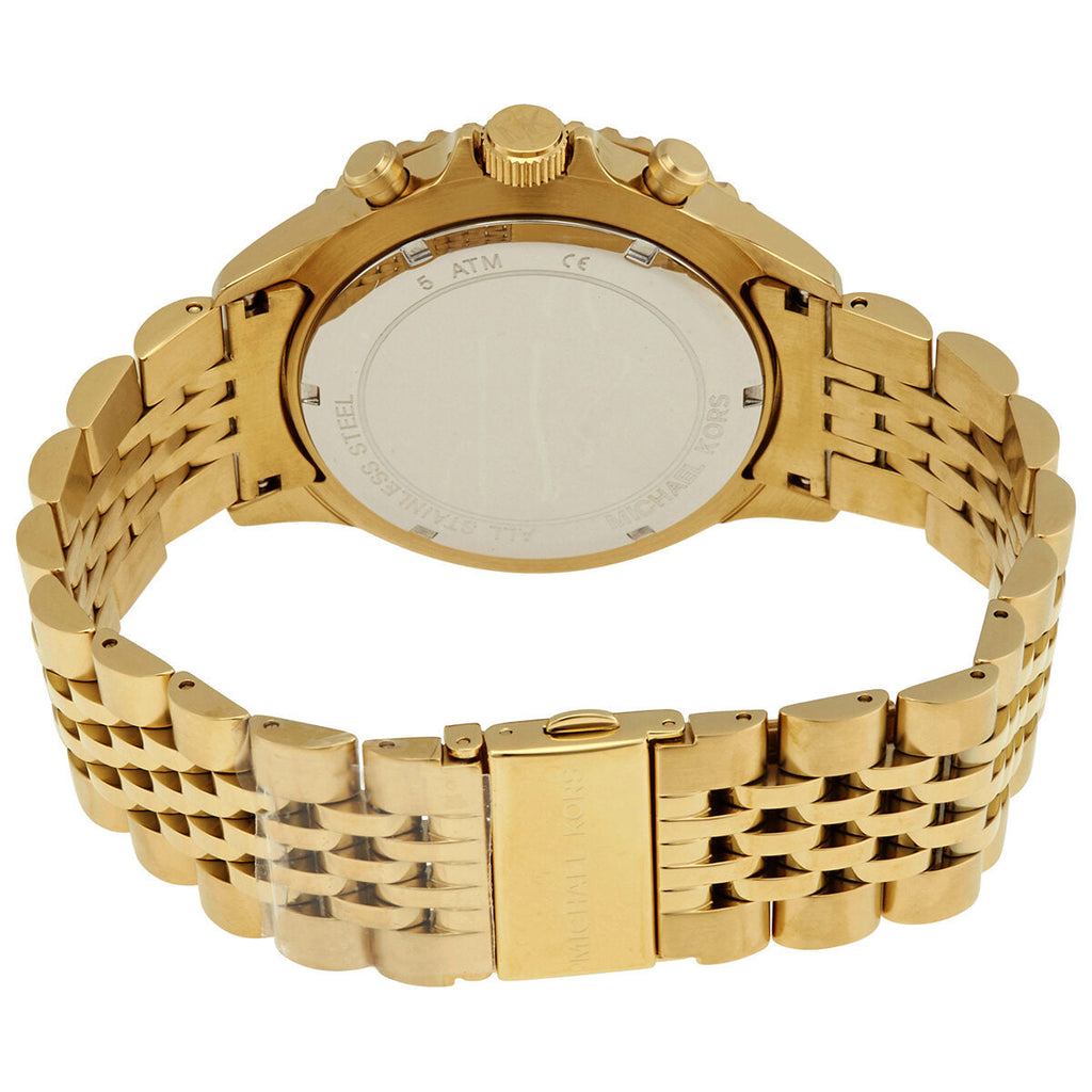 Yellow gold-tone stainless steel case and bracelet. Uni-directional rotating yellow gold-tone bezel with a black ring. Black dial with lumionous yellow gold-tone hands and index hour markers. Minute markers around the outer rim. Dial Type: Analog. Luminescent hands. Date display between the 4 and 5 o'clock positions. Quartz movement. Scratch resistant mineral crystal. Solid case back. Round case shape. Case size: 44 mm. Case thickness: 11 mm. Band width: 22 mm. Fold over clasp with a safety release. Water resistant at 50 meters / 165 feet. Functions: chronograph, date, hour, minute, second. Bayville Series. Casual watch style. Michael Kors Bayville Chronograph Quartz Black Dial Men's Watch MK8726.