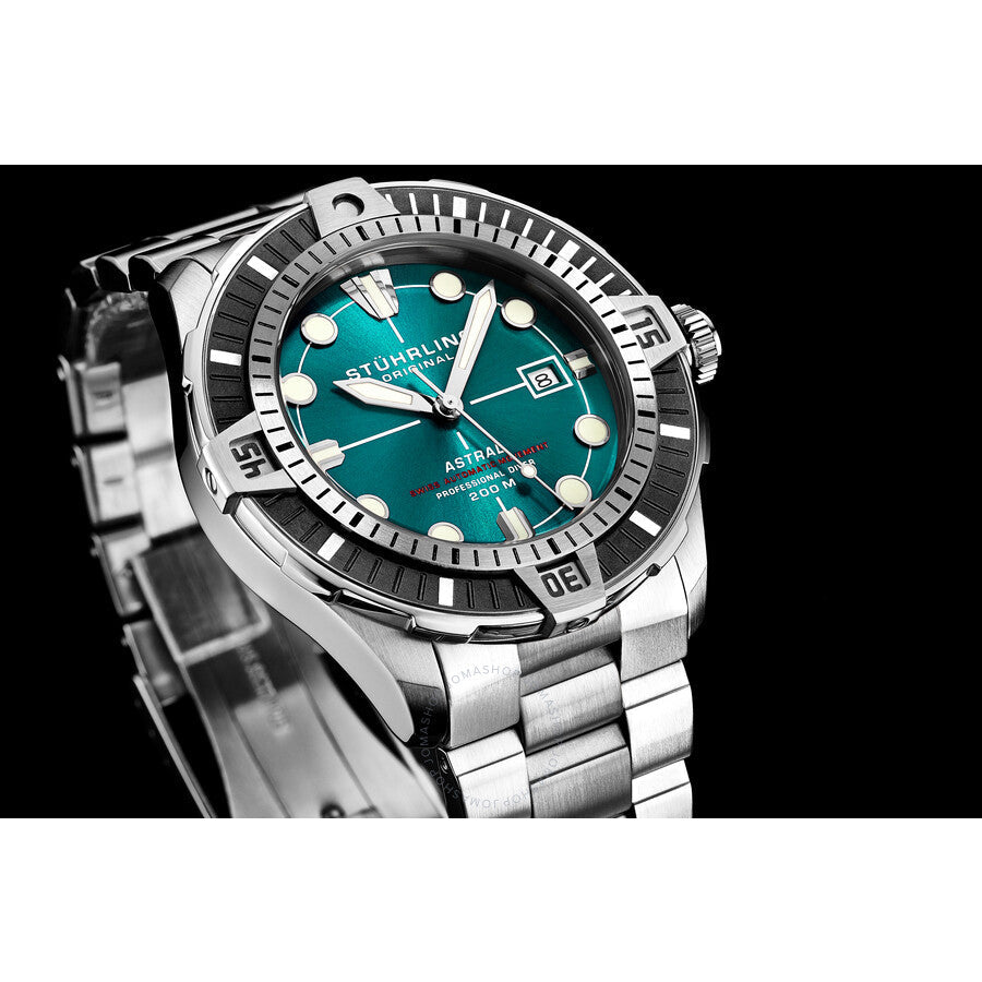 Silver-tone stainless steel case and bracelet. Uni-directional rotating grey stainless steel bezel. Green dial with silver-tone hands and index hour markers. Dial Type: Analog. Luminescent hands and markers. Date display at the 3 o'clock position. Automatic movement. Scratch resistant mineral crystal. Screw down crown. Transparent case back. Round case shape, case size: 44 mm, case thickness: 14 mm. Band width: 24 mm, band length: 7.5 inches. Fold over clasp with a safety release. Water resistant at 200 meters / 660 feet. Functions: date, hour, minute, second. Aquadiver Series. Dive watch style. Stuhrling Original Aquadiver Automatic Green Dial Men's Watch M16744.