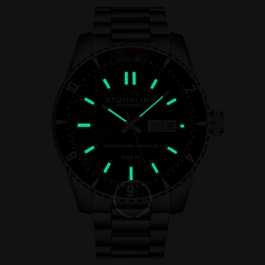 Silver-tone stainless steel case and bracelet. Uni-directional rotating silver-tone stainless steel bezel. Green dial with silver-tone hands and index hour markers. Minute markers around the outer rim. Dial Type: Analog. Luminescent hands and markers. Day of the week and date display at the 3 o'clock position. Automatic movement. Scratch resistant mineral crystal. Screw down crown. Transparent case back. Round case shape, case size: 44 mm, case thickness: 16 mm. Band width: 22 mm, band length: 7.5 inches. Fold over clasp with a safety release. Water resistant at 200 meters / 660 feet. Functions: date, day, hour, minute, second. Aquadiver Series. Dive watch style. Stuhrling Original Aquadiver Automatic Green Dial Men's Watch M16761.