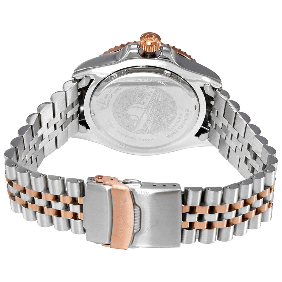 A crown jewel of the aquadiver collection, the Meridian GMT Diver features Quartz movement for ultra-precision while staying water-resistant up to 330 feet. Silver-tone alloy case with a two-tone (silver-tone and rose gold-tone) stainless steel bracelet. Bi-directional rotating rose gold-tone alloy bezel with an inlaid black ring showing 24 hour markers. Black dial with luminous rose gold-tone hands and dot hour markers. Minute markers around the outer rim. Dial Type: Analog. Luminescent hands and markers. Date display at the 3 o'clock position. Quartz movement. Scratch resistant mineral crystal. Screw down crown. Solid case back. Round case shape. Case size: 42 mm. Case thickness: 12 mm. Band width: 22 mm. Fold over clasp with a safety release. Water resistant at 100 meters / 330 feet. Functions: date, hour, minute, second 24 hour. Aquadiver Series. Dive watch style. Stuhrling Original Aquadiver Black Dial Men's Watch M15975.