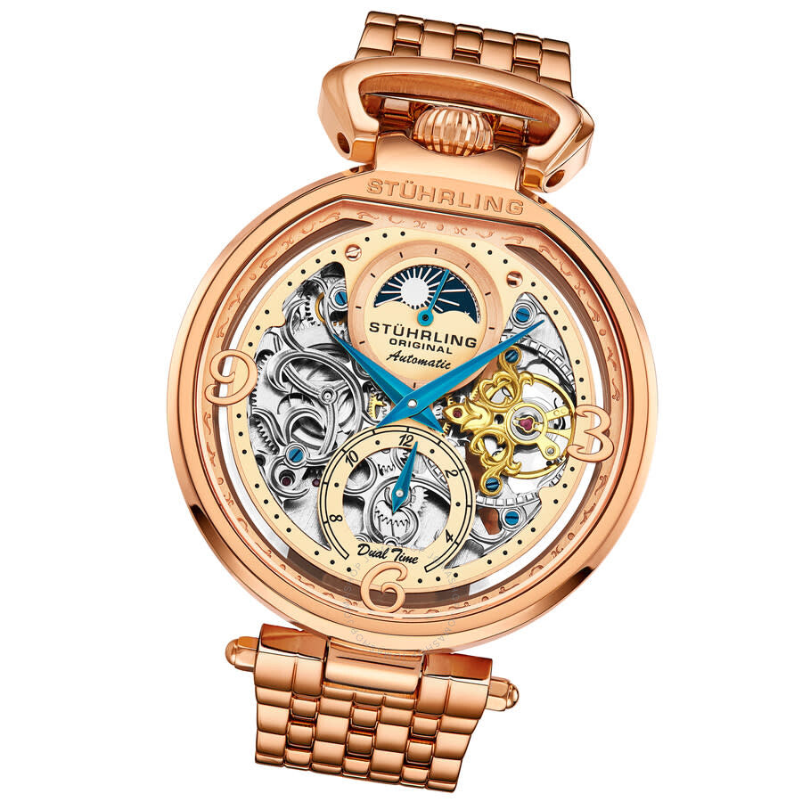 Men's Stainless Steel Automatic Dual Time; Rose Toned Case; Blue Hands; Cream Skeleton Dial; Rose Toned Bracelet. Rose gold-tone alloy case with a rose gold-tone stainless steel bracelet. Fixed rose gold-tone alloy bezel. Rose gold-tone dial with blue hands and Arabic numeral hour markers. Dial Type: Analog. Automatic movement. Transparent see through case back. Round case shape, case size: 46 mm. Fold over clasp with a safety release. Functions: hour, minute, second. Additional Info: am/pm indicator, dual time. Legacy Series. Dress watch style. Stuhrling Original Legacy Automatic Rose Gold Dial Men's Watch M17979.