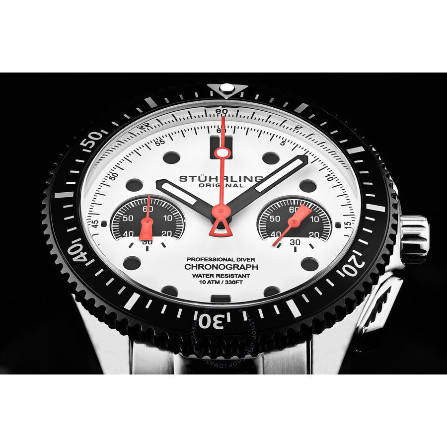A watch made for the athletic man who still appreciates style, introducing the Velocity. Stay focused, exceed your own limits, and feel on top of the world with this modern and efficient design. Silver-tone alloy case with a silver-tone stainless steel bracelet. Fixed black alloy bezel. Silver-tone dial with black hands and index hour markers. Minute markers around the outer rim. Dial Type: Analog. Luminescent hands and markers. Date display at the 6 o'clock position. Quartz movement. Scratch resistant mineral crystal. Screw down crown. Solid case back. Round case shape, case size: 42 mm. Band width: 20 mm. Fold over clasp with a safety release. Water resistant at 100 meters / 330 feet. Functions: chronograph, date, hour, minute, second. Monaco Series. Sport watch style. Stuhrling Original Monaco Chronograph Quartz Silver Dial Men's Watch M17090.