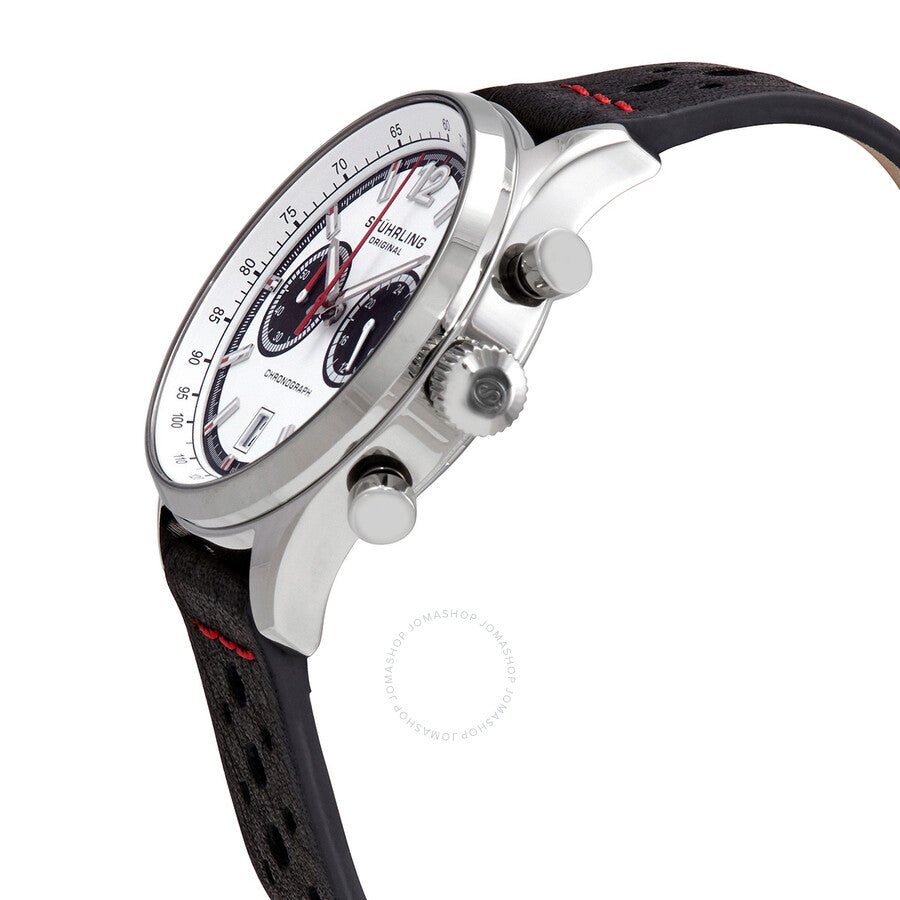 Shift into top gear with the smooth chronograph style of the Monaco . Stainless steel case with a black leather strap. Fixed stainless steel bezel. White dial with luminous silver-tone hands and index hour markers. An Arabic numeral appears at the 12 o'clock position. Minute markers. Tachymeter markings around the outer rim. Dial Type: Analog. Luminescent hands and markers. Date display at the 6 o'clock position. Chronograph - two black sub-dials displaying: 60 seconds and 24 hour. Quartz movement. Scratch resistant mineral crystal. Pull / push crown. Solid case back. Round case shape. Case size: 44 mm. Case thickness: 12 mm. Band width: 20 mm. Tang clasp. Water resistant at 50 meters / 165 feet. Functions: chronograph, tachymeter, date, hour, minute, second. Monaco Series. Sport watch style. Stuhrling Original Monaco White Dial Men's Watch M15559.