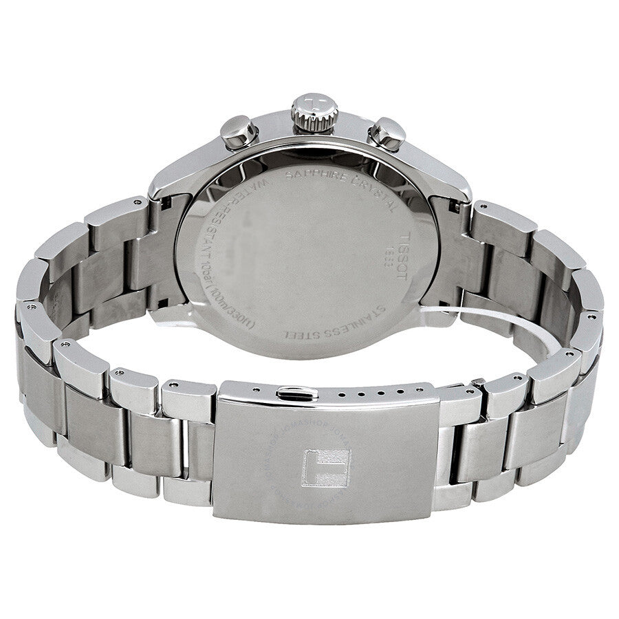 Stainless steel case with a stainless steel bracelet. Fixed stainless steel bezel. Black dial with luminous silver-tone alpha-style shape hands and Arabic numeral hour markers. Minute markers around the outer rim. Dial Type: Analog. Luminescent hands and markers. Date display at the 4 o'clock position. Chronograph - three sub-dials displaying: 60 second, 30 minute and 1/10th of a second. ETA Caliber G10.212 quartz movement. Scratch resistant sapphire crystal. Pull / push crown. Solid case back. Round case shape. Case size: 45 mm. Case thickness: 11.02 mm. Band width: 22 mm. Fold over clasp with a safety release. Water resistant at 100 meters / 330 feet. Functions: chronograph, rattrapante, date, hour, minute, small second. Sport watch style. Watch label: Swiss Made. Tissot Chrono XL Classic Black Dial Men's Watch T116.617.11.057.01.
