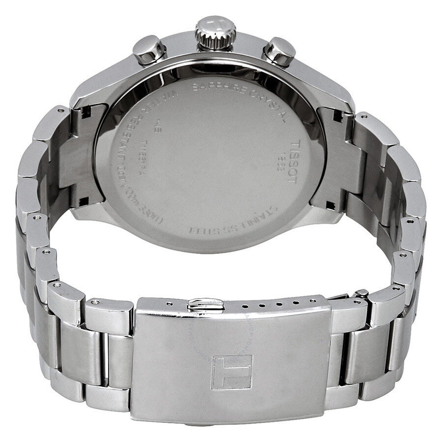 Stainless steel case with a stainless steel bracelet. Fixed stainless steel bezel. Blue dial with luminous silver-tone alpha-style hands and Arabic numeral hour markers. Minute markers around the outer rim. Dial Type: Analog. Luminescent hands and markers. Date display at the 4 o'clock position. Chronograph - three sub-dials displaying: 60 second, 30 minute and 1/10th of a second. ETA Caliber G10.212 quartz movement. Scratch resistant sapphire crystal. Solid case back. Round case shape. Case size: 45 mm. Case thickness: 11.02 mm. Band width: 22 mm. Fold over clasp with a push button release. Water resistant at 100 meters / 330 feet. Functions: chronograph, rattrapante, date, hour, minute, small second. Sport watch style. Watch label: Swiss Made. Tissot Chrono XL Classic Blue Dial Men's Watch T116.617.11.047.01.