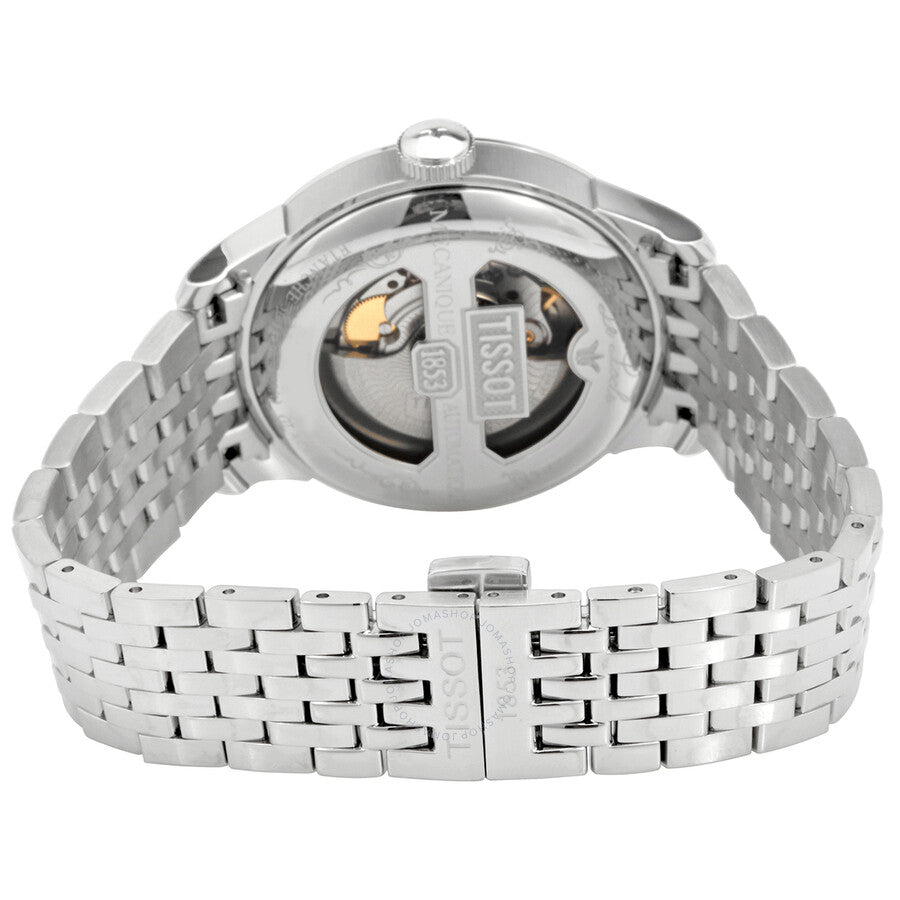 Stainless steel case with a stainless steel bracelet. Fixed stainless steel bezel. Blue dial with silver-tone hands and Roman numeral hour markers. Minute markers around the outer rim. Dial Type: Analog. Date display at the 3 o'clock position. Tissot calibre Powermatic 80 (C07.111) automatic movement, based upon ETA 2824-2, containing 23 Jewels, bitting at 21600 vph, and has a power reserve of approximately 80 hours. Scratch resistant sapphire crystal. Pull / push crown. Transparent case back. Round case shape. Case size: 39.3 mm. Case thickness: 9.8 mm. Band width: 19 mm. Deployment clasp with a push button release. Water resistant at 30 meters / 100 feet. Functions: date, hour, minute, second. Le Locle Series. Casual watch style. Watch label: Swiss Made. Tissot Le Locle Automatic Blue Dial Men's Watch T006.407.11.043.00.
