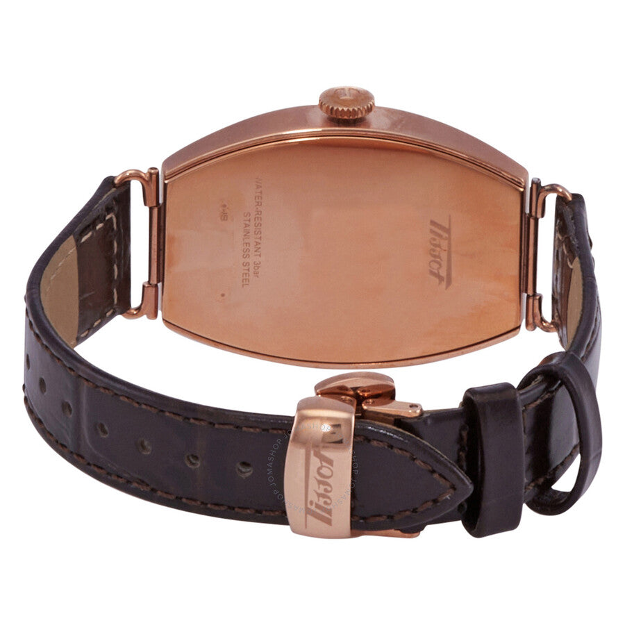 Rose gold PVD stainless steel case with a brown leather strap. Fixed rose gold PVD bezel. Silver dial with black hands and Arabic numeral hour markers. Minute markers around an inner ring. Dial Type: Analog. Quartz movement. Scratch resistant mineral crystal. Pull / push crown. Solid case back. Tonneau case shape. Case dimensions: 42.45 mm x 31.10 mm. Case thickness: 10.5 mm. Band width: 16 mm. Butterfly clasp. Water resistant at 30 meters / 100 feet. Functions: hour, minute. Casual watch style. Watch label: Swiss Made. Tissot Quartz Silver Dial Men's Watch T128.509.36.032.00.