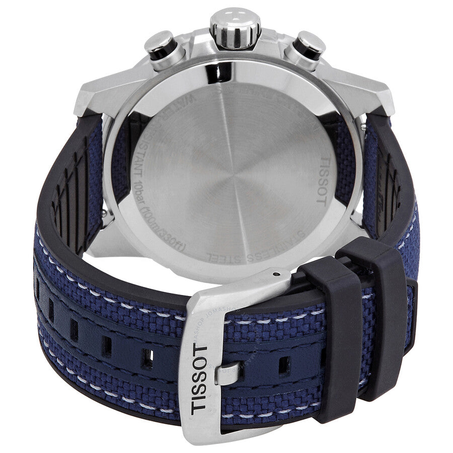 Stainless steel case with a black leather strap with a (stiched) blue textile top. Fixed stainless steel bezel with black aluminium ring showing tachymeter markings. Black dial with luminous grey hands and index hour markers. Minute markers around the outer rim. Dial Type: Analog. Luminescent hands and markers. Date display at the 6 o'clock position. Chronograph - three sub-dials displaying: 60 second, 30 minute and 1/10th of a second. ETA caliber G10.212 quartz movement. Scratch resistant sapphire crystal. Pull / push crown. Solid case back. Round case shape. Case size: 45.5 mm. Case thickness: 11.9 mm. Band width: 22 mm. Tang clasp. Water resistant at 100 meters / 330 feet. Functions: chronograph, rattrapante, date, hour, minute, small second. Supersport Series. Sport watch style. Watch label: Swiss Made. Tissot Supersport Chronograph Quartz Black Dial Men's Watch T125.617.17.051.03.