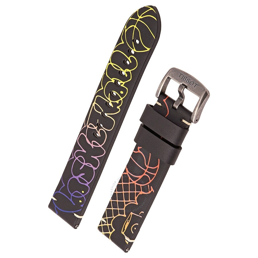 Antique PVD stainless steel case with a black leather strap. Fixed antique PVD bezel. Anthracite dial with silver-tone alpha-style hands and index hour markers. Arabic numerals mark the 3, 6, 9 and 12 o'clock positions. Minute markers around the outer rim. Dial Type: Analog. Luminescent hands and markers. Date display at the 4 o'clock position. Chronograph - three sub-dials displaying: 60 second, 30 minute and 1/10th of a second. ETA caliber G10.212 quartz movement. Scratch resistant sapphire crystal. Pull / push crown. Solid case back. Round case shape. Case size: 45 mm. Case thickness: 11.02 mm. Band width: 22 mm. Tang clasp. Water resistant at 100 meters / 330 feet. Functions: chronograph, rattrapante, date, hour, minute, small second. Sport watch style. Watch label: Swiss Made. Tissot XL 3X3 Street Basketball Chronograph Anthracite Dial Men's Watch T116.617.36.067.00.