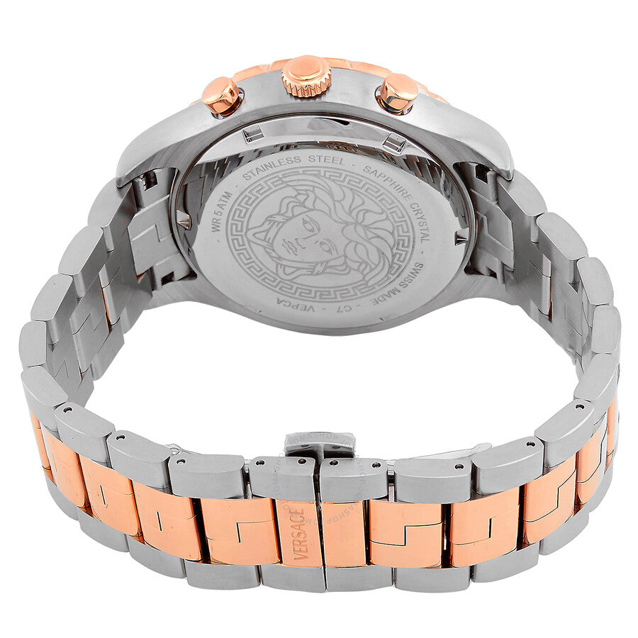Silver-tone stainless steel case with a two-tone (silver-tone and rose gold-tone) stainless steel bracelet. Fixed tachymeter scale rose gold-tone stainless steel bezel with a black top ring. Green dial with index hour markers. Minute markers around the outer rim. Dial Type: Analog. Luminescent hands and markers. Date display at the 4 o'clock position. Chronograph - three sub-dials displaying: 60 second, 30 minute and 1/10th of a second. Quartz movement. Scratch resistant sapphire crystal. Pull / push crown. Solid case back. Round case shape, case size: 43 mm. Water resistant at 50 meters / 165 feet. Functions: chronograph, date, hour, minute, second. Hellenyium Series. Dress watch style. Watch label: Swiss Made. Versace Hellenyium Chronograph Quartz Green Dial Men's Watch VEPCA0424.