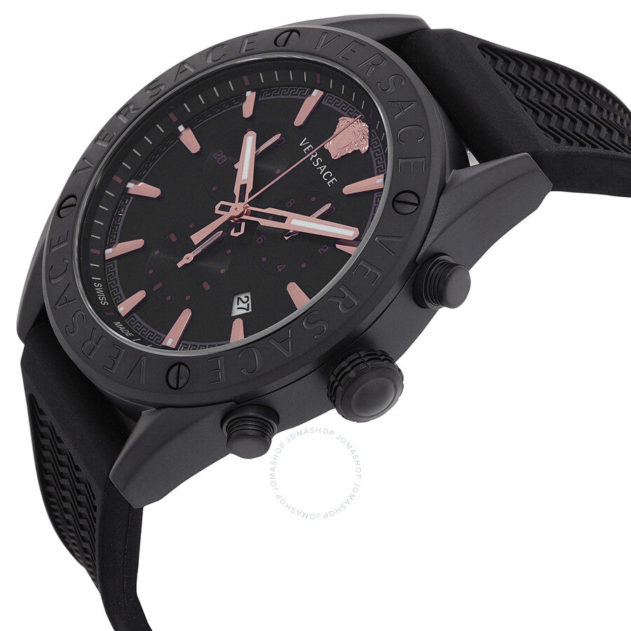 Black IP stainless steel case with a black silicone strap. Fixed black IP stainless steel bezel. Black dial with silver-tone hands and index hour markers. Minute markers around the outer rim. Dial Type: Analog. Luminescent hands and markers. Date display at the 4 o'clock position. Chronograph - three sub-dials displaying: 60 second, 30 minute and 1/10th of a second. Quartz movement. Scratch resistant sapphire crystal. Pull / push crown. Solid case back. Round case shape, case size: 44 mm. Band width: 20 mm. Tang clasp. Water resistant at 50 meters / 165 feet. Functions: chronograph, date, hour, minute, second. V-chrono Series. Casual watch style. Watch label: Swiss Made. Versace V-Chrono Quartz Black Dial Men's Watch VEHB00419.