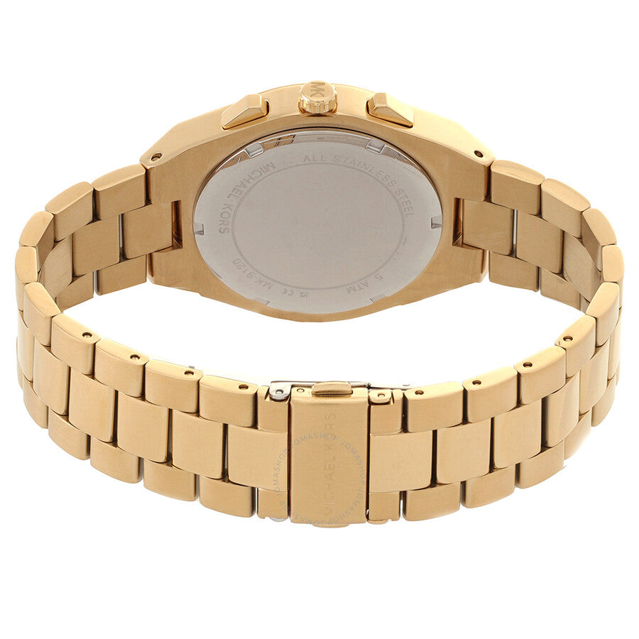 Gold-tone stainless steel case and bracelet. Fixed gold-tone stainless steel bezel. White dial with gold-tone hands and index hour markers. Minute markers around the outer rim. Dial Type: Analog. Date display between 4 and 5 o'clock position. Chronograph - three sub-dials displaying: 60 second, 30 minute and 24 hour. Quartz movement. Scratch resistant mineral crystal. Pull / push crown. Solid case back. Round case shape, case size: 41 mm. Band width: 22 mm. Deployment with push button release clasp. Water resistant at 50 meters / 165 feet. Functions: chronograph, date, hour, minute, second. Lennox Series. Sport watch style. Michael Kors Lennox Chronograph Quartz White Dial Men's Watch MK9120.