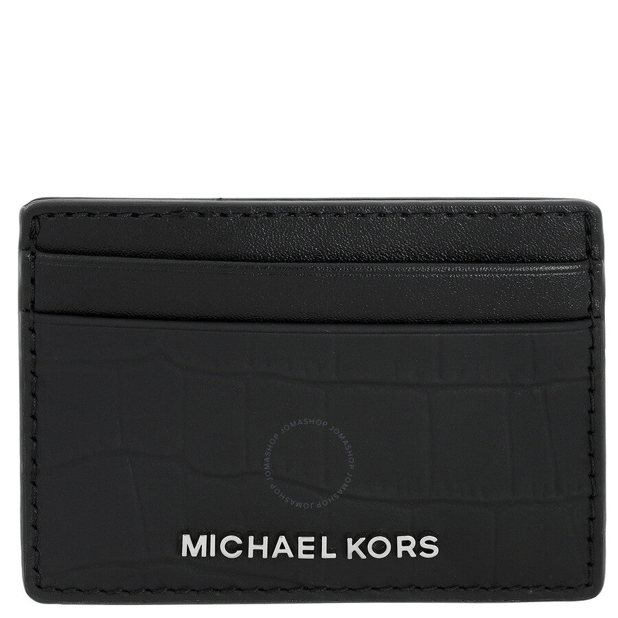 Silver-tone stainless steel case and bracelet. Fixed silver-tone stainless steel bezel. Black dial with silver-tone hands and index-Roman numeral hour markers. Minute markers around the outer rim. Dial Type: Analog. Date display between 4 and 5 o'clock position. Chronograph - three sub-dials displaying: 60 second, 30 minute and 24 hour. Quartz movement. Scratch resistant mineral crystal. Solid case back. Round case shape, case size: 44 mm. Band width: 22 mm. Fold over clasp with a safety release. Water resistant at 100 meters / 330 feet. Functions: chronograph, date, hour, minute, second. Additional Info: card case: 4”l x 2.5”h. Lexington Series. Sport watch style. Michael Kors Lexington Chronograph Quartz Watch and Card Case Gift Set MK1091SET.