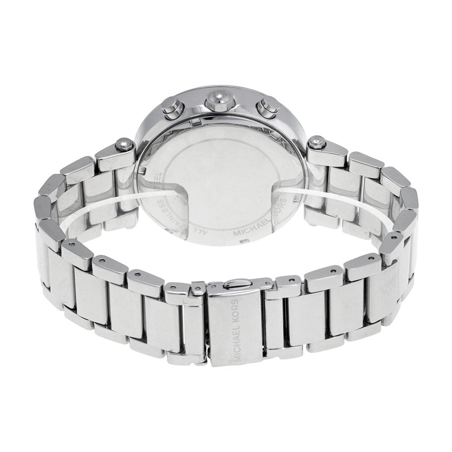 Stainless steel case with a stainless steel bracelet. Fixed silver-tone bezel set with zircon crystals. Navy dial with luminous silver-tone hands and crystal index hour markers. An Arabic numeral appears at 12 o'clock. Minute markers around the outer rim. Dial Type: Analog. Luminescent hands. Date display between the 4 and 5 o'clock positions. Chronograph - three sub-dials displaying: 60 second, 60 minute and 24 hour. Quartz movement. Scratch resistant mineral crystal. Pull / push crown. Solid case back. Case diameter: 39 mm. Round case shape. Band width: 20 mm. Deployment clasp. Water resistant at 100 meters / 330 feet. Functions: chronograph, date, hour, minute, second. Casual watch style. Michael Kors Parker Chronograph Navy Dial Stainless Steel Ladies Watch MK6117.