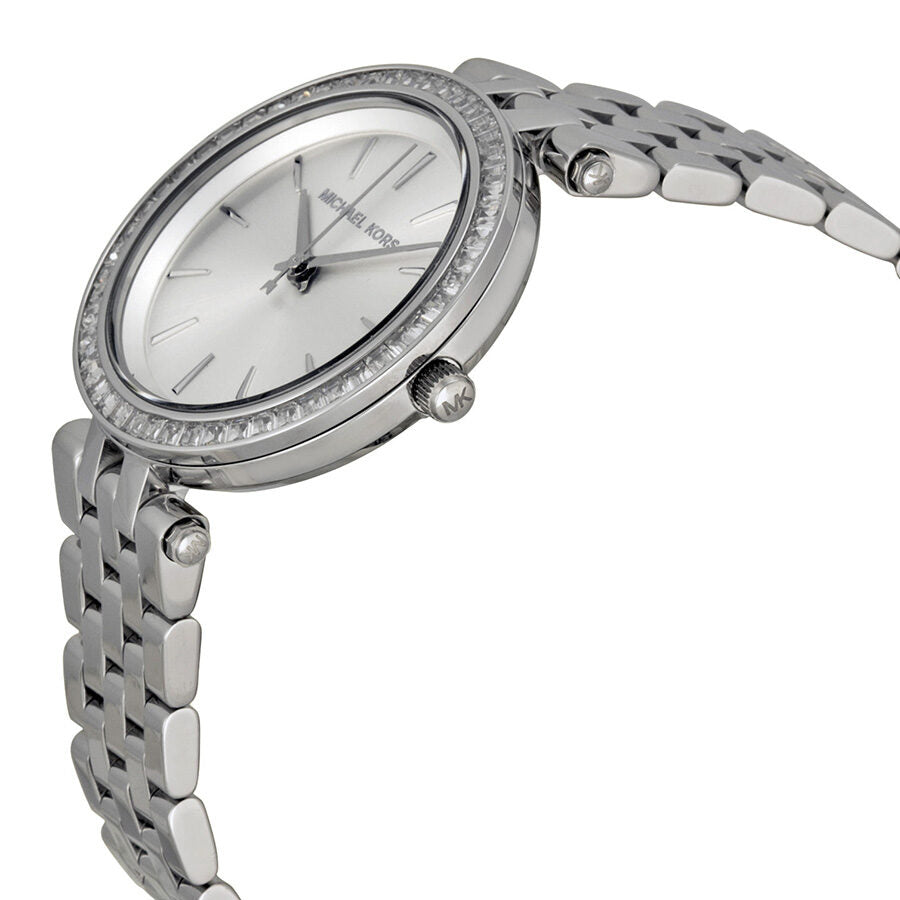 Stainless steel case with a stainless steel bracelet. Fixed stainless steel bezel set with crystals. Silver dial with silver-tone hands and index hour markers. Dial Type: Analog. Luminescent hands and markers. Quartz movement. Scratch resistant mineral crystal. Pull / push crown. Solid case back. Case diameter: 33 mm. Case thickness: 7 mm. Round case shape. Band width: 16 mm. Deployment clasp. Water resistant at 50 meters / 165 feet. Functions: hour, minute, second. Casual watch style. Michael Kors Petite Darci Silver Dial Steel Ladies Watch MK3364.