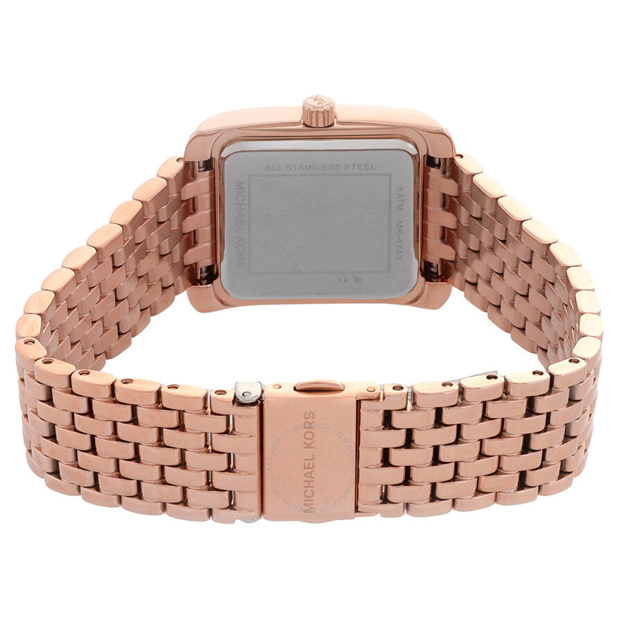 Rose gold-tone stainless steel case and bracelet. Fixed rose gold-tone bezel with crystal set. White dial with rose gold-tone hands and Roman numeral hour markers. Dial Type: Analog. Quartz movement. Scratch resistant mineral crystal. Pull / push crown. Solid case back. Rectangle case shape, case size: 33 mm. Band width: 18 mm. Fold over clasp with a safety release. Water resistant at 50 meters / 165 feet. Functions: hour, minute, second. Emery Series. Dress watch style. Michael Kors Emery Quartz Crystal White Dial Ladies Watch MK4743.