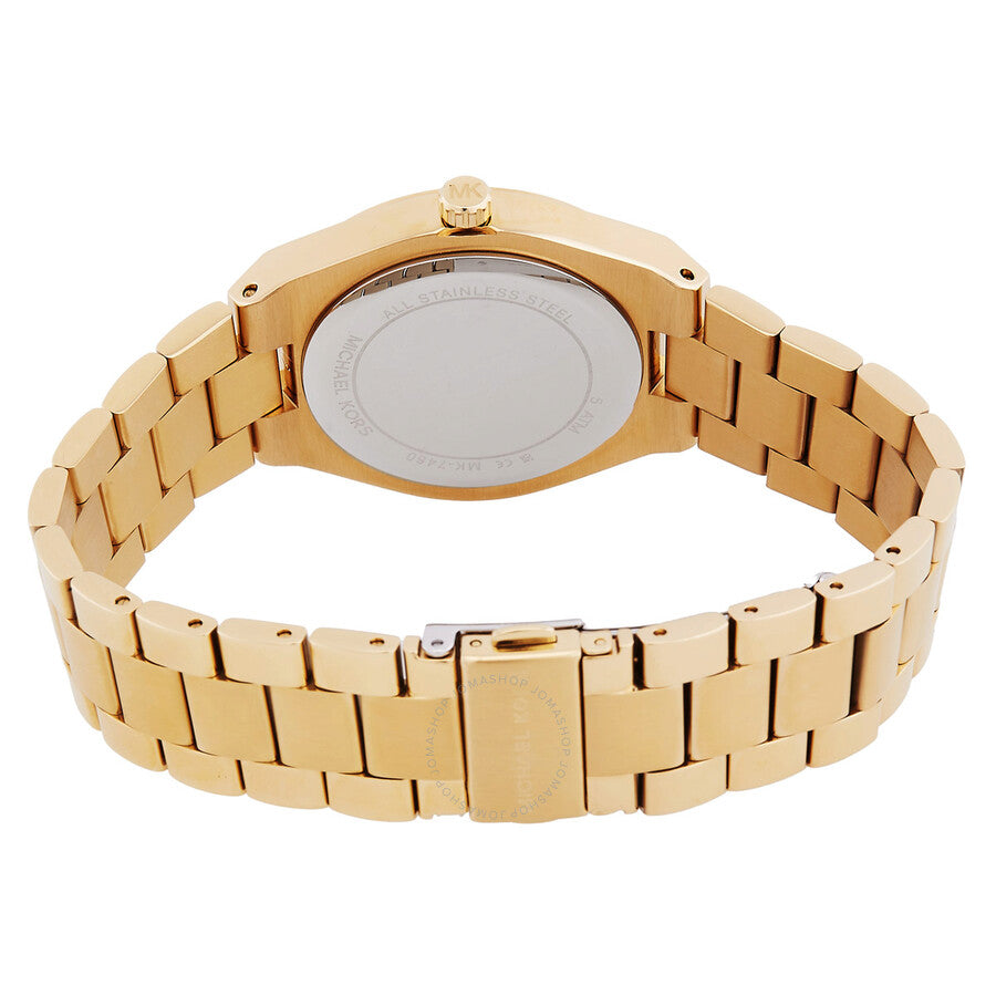 Yellow gold-tone stainless steel case and bracelet. Fixed yellow gold-tone stainless steel bezel. Blue dial with yellow gold-tone hands and Roman numeral hour markers. Minute markers around the outer rim. Dial Type: Analog. Quartz movement. Scratch resistant mineral crystal. Round case shape, case size: 37 mm, case thickness: 9 mm. Band width: 20 mm, band length: 7.5 inches. Fold over clasp with a safety release. Functions: hour, minute, second. Lennox Series. Casual watch style. Michael Kors Lennox Quartz Blue Dial Ladies Watch MK7460.