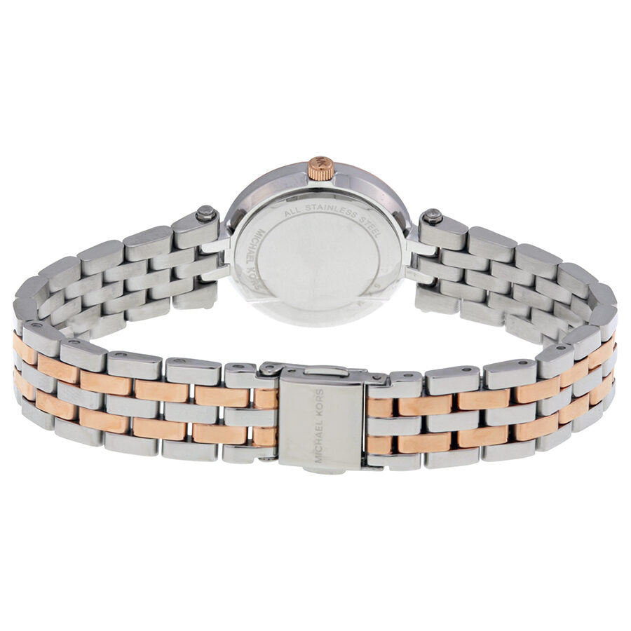 Stainless steel case with a two-tone (silver and rose gold-tone) stainless steel bracelet. Fixed rose gold-tone bezels set with crystals. Silver dial with rose gold-tone hands and index hour markers. Dial Type: Analog. Quartz movement. Scratch resistant mineral crystal. Pull / push crown. Solid case back. Case size: 26 mm. Case thickness: 7 mm. Round case shape. Band width: 16 mm. Deployment clasp. Water resistant at 50 meters / 165 feet. Functions: hour, minute, second. Casual watch style. Michael Kors Petite Darci Silver Dial Two-tone Ladies Watch MK3298.