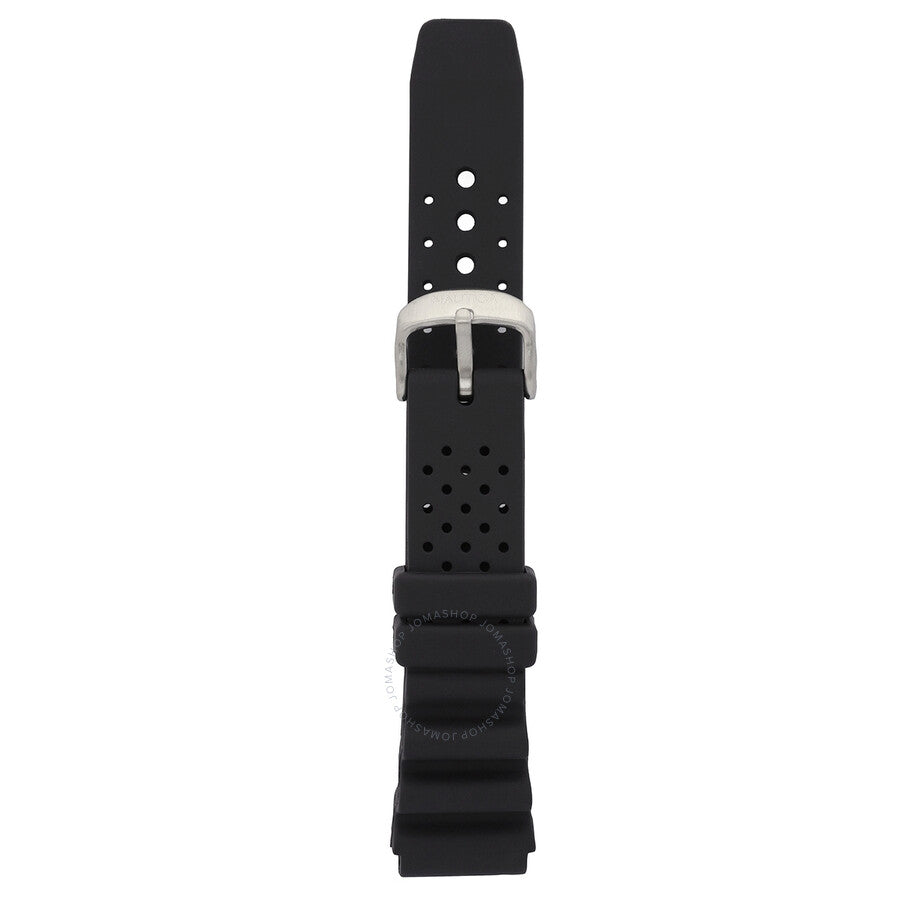 Silver-tone stainless steel case and bracelet. Uni-directional rotating black stainless steel bezel. Black dial with silver-tone hands and index hour markers. Minute markers around the outer rim. Dial Type: Analog. Date display at the 3 o'clock position. Solar-powered movement. Scratch resistant mineral crystal. Pull / push crown. Solid case back. Round case shape, case size: 43 mm, case thickness: 12 mm. Band width: 20 mm. Fold over clasp with a safety release. Water resistant at 50 meters / 165 feet. Functions: date, hour, minute, second. Cocoa Beach Series. Casual watch style. Watch label: Japan Movt. Nautica Cocoa Beach Solar-Powered Black Dial Men's Watch NAPCBS307.