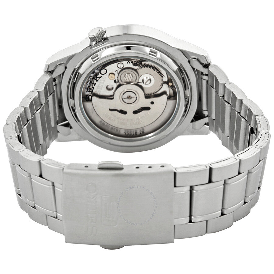 Stainless steel case with a stainless steel bracelet. Fixed stainless steel bezel. Black dial with luminous silver-tone hands and index hour markers. Arabic numeral minute markers (at 5 minute intervals). Minute markers around the outer rim. Dial Type: Analog. Luminescent hands and markers. Day of the week and date display at the 3 o'clock position. Seiko caliber 7S26 automatic movement, based upon Seiko 7002, containing 21 Jewels, bitting at 21600 vph, and has a power reserve of approximately 40 hours. Scratch resistant mineral crystal. Pull / push crown. Transparent case back. Round case shape. Case size: 38 mm. Case thickness: 11 mm. Band width: 19 mm. Fold over clasp with a push button release. Water resistant at 30 meters / 100 feet. Functions: date, day, hour, minute, second. 5 Series. Casual watch style. Watch label: Japan Movt. Seiko 5 Automatic Black Dial Men's Watch SNKK31K1.