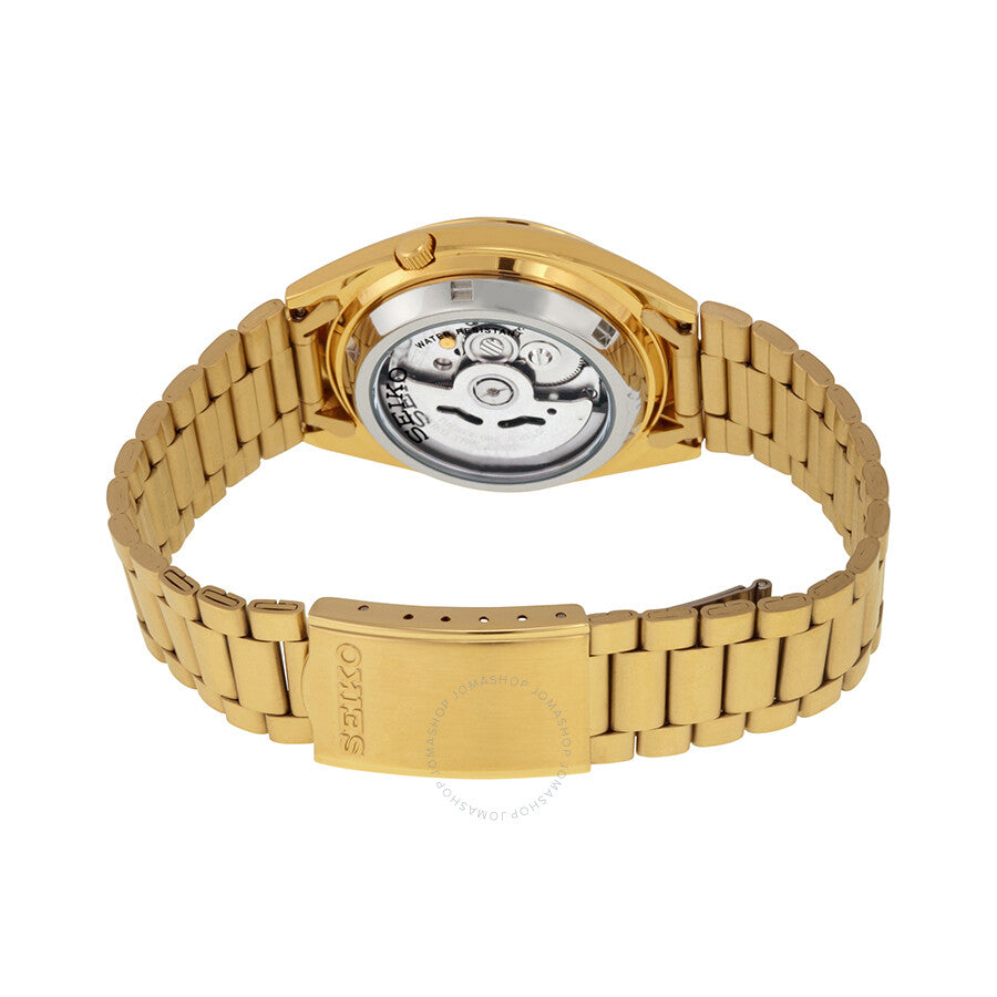 Gold-tone stainless steel case and bracelet. Fixed gold-tone bezel. Champagne dial with luminous hands and index hour markers. Minute markers around the outer rim. Dial Type: Analog. Luminescent hands and markers. Day of the week and date display at the 3 o'clock position. Seiko caliber 7S26 automatic movement, based upon Seiko 7002, containing 21 Jewels, bitting at 21600 vph, and has a power reserve of approximately 40 hours. Scratch resistant Hardlex crystal. Pull / push crown. Skeleton case back. Round case shape. Case size: 37 mm. Case thickness: 11 mm. Band width: 19 mm. Fold over clasp. Water resistant at 100 meters / 330 feet. Functions: date, day, hour, minute, second. Seiko 5 Series. Dress watch style. Seiko 5 Automatic Champagne Dial Men's Watch SNXL72.
