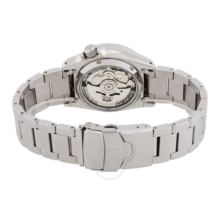 Silver-tone stainless steel case and bracelet. Uni-directional rotating silver-tone stainless steel bezel with an inlaid black ring. Orange dial with gold-tone hands and index hour markers. Minute markers around the outer rim. Dial Type: Analog. Luminescent hands and markers. Day of the week and date display at the 3 o'clock position. Seiko Caliber 4R36 Automatic movement, containing 24 Jewels, bitting at 21600 vph, and has a power reserve of approximately 41 hours. Scratch resistant Hardlex crystal. Transparent case back. Round case shape, case size: 38 mm, case thickness: 12.1 mm. Band width: 20 mm. Fold over clasp with a safety release. Water resistant at 100 meters / 330 feet. Functions: date, day, hour, minute, second. Seiko 5 Series. Sport watch style. Watch label: Japan Movt. Seiko 5 Automatic Orange Dial Men's Watch SRPK35K1.