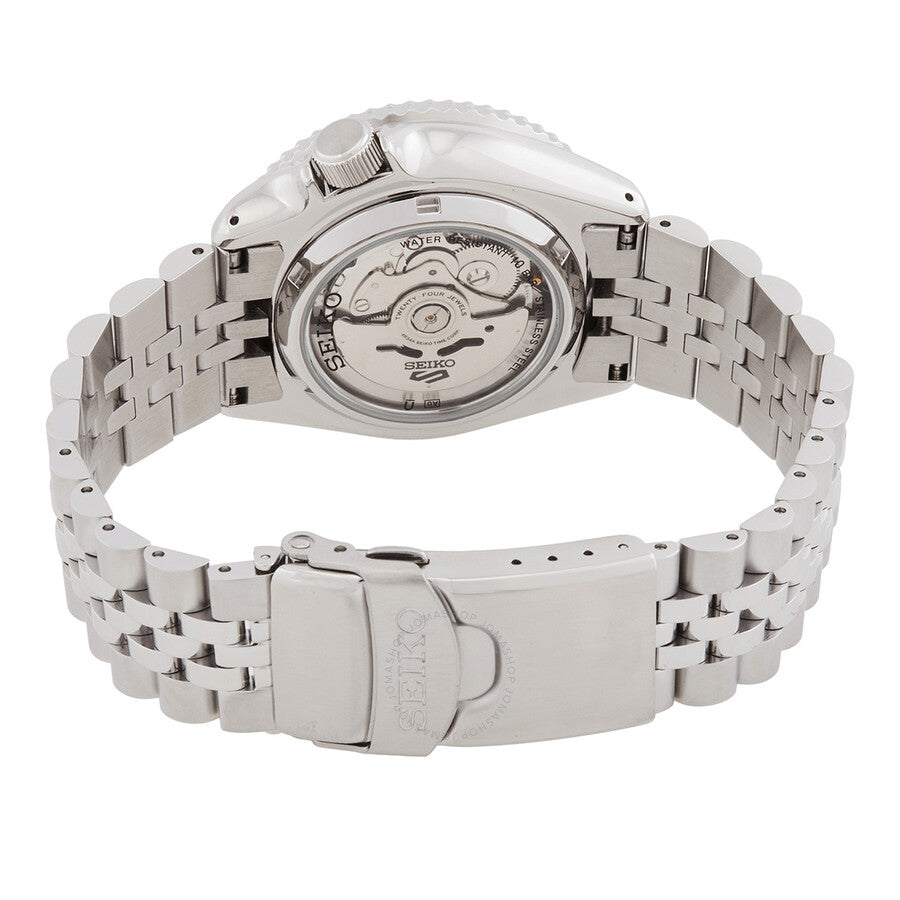 Silver-tone stainless steel case and bracelet. Uni-directional rotating silver-tone stainless steel bezel with an inlaid black and grey ring. Black dial with silver-tone hands and index hour markers. Minute markers around the outer rim. Dial Type: Analog. Luminescent hands and markers. Date display at the 3 o'clock position. Seiko Caliber 4R34 Automatic movement, containing 24 Jewels, bitting at 21600 vph, and has a power reserve of approximately 41 hours. Scratch resistant Hardlex crystal. Transparent case back. Round case shape, case size: 42.5 mm, case thickness: 13.6 mm. Band width: 22 mm. Fold over clasp with a safety release. Water resistant at 100 meters / 330 feet. Functions: date, GMT, hour, minute, second. 5 Sports Series. Sport watch style. Watch label: Japan Movt. Seiko 5 Sports Automatic Black Dial Men's Watch SSK001K1.