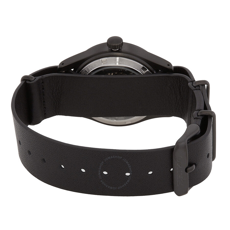 Black stainless steel case with a black calfskin leather strap. Uni-directional rotating black stainless steel bezel. Black dial with silver-tone hands and index-Arabic numeral hour markers. Minute markers around the outer rim. Dial Type: Analog. Luminescent hands and markers. Date display at the 3 o'clock position. Seiko Caliber 4R34 Automatic movement, containing 24 Jewels, bitting at 21600 vph, and has a power reserve of approximately 41 hours. Scratch resistant Hardlex crystal. Transparent see through case back. Round case shape, case size: 39.4 mm, case thickness: 13.6 mm. Buckle clasp. Water resistant at 100 meters / 330 feet. Functions: date, hour, minute, second. 5 Sports Series. Sport watch style. Watch label: Japan Movt. Item Variations: SSK025. Seiko 5 Sports Automatic Black Dial Men's Watch SSK025K1.
