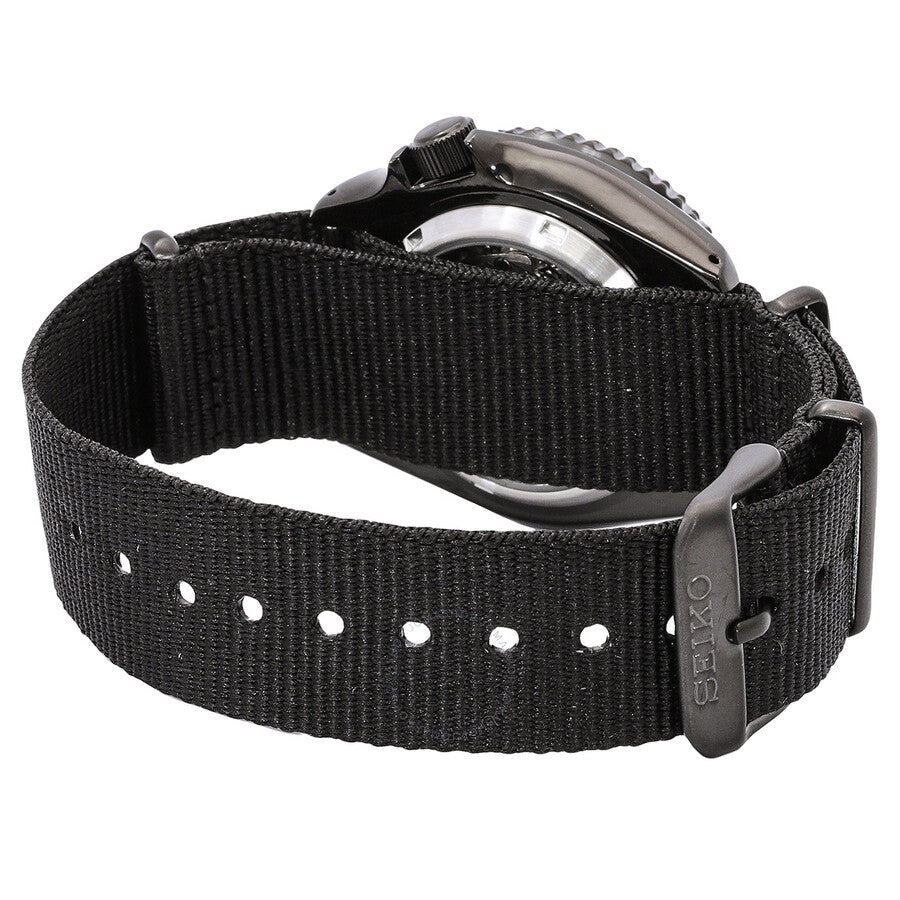 Black PVD stainless steel case with a black nylon strap. Uni-directional rotating black PVD stainless steel bezel. Green camouflage dial with silver-tone hands and index hour markers. Minute markers around the outer rim. Dial Type: Analog. Luminescent hands and markers. Day of the week and date display at the 3 o'clock position. Seiko Caliber 4R36 Automatic movement, containing 24 Jewels, bitting at 21600 vph, and has a power reserve of approximately 41 hours. Scratch resistant mineral crystal. Solid case back. Round case shape, case size: 42.5 mm, case thickness: 13.4 mm. Band width: 22 mm. Buckle clasp. Water resistant at 100 meters / 330 feet. Functions: date, day, hour, minute, second. 5 Sports Series. Sport watch style. Watch label: Japan Movt. Seiko 5 Sports Automatic Green Camouflage Dial Men's Watch SRPJ37K1.