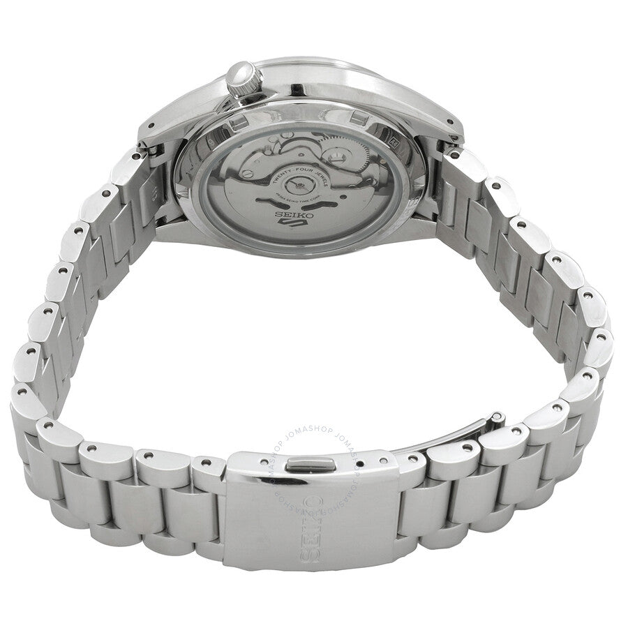 Silver-tone stainless steel case and bracelet. Fixed silver-tone stainless steel bezel. Black dial with silver-tone hands and index hour markers. Minute markers around the outer rim. Dial Type: Analog. Luminescent hands and markers. Day of the week and date display at the 3 o'clock position. Seiko Caliber 4R36 Automatic movement, containing 24 Jewels, bitting at 21600 vph, and has a power reserve of approximately 41 hours. Scratch resistant curved Hardlex crystal. Transparent case back. Round case shape, case size: 37.4 mm, case thickness: 12.5 mm. Band width: 18 mm. Fold over clasp with a safety release. Water resistant at 100 meters / 330 feet. Functions: date, day, hour, minute, second. 5 Sports Series. Sport watch style. Watch label: Japan Movt. Seiko 5 Sports SNXS Automatic Black Dial Men's Watch SRPK89K1.
