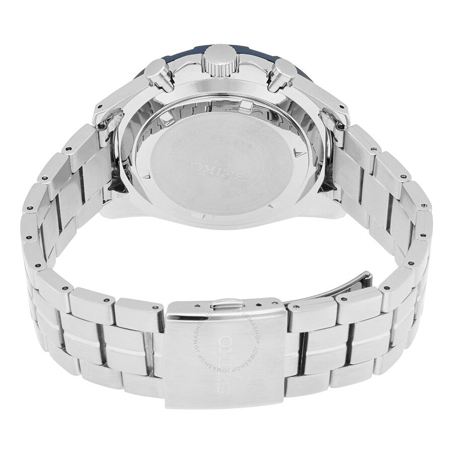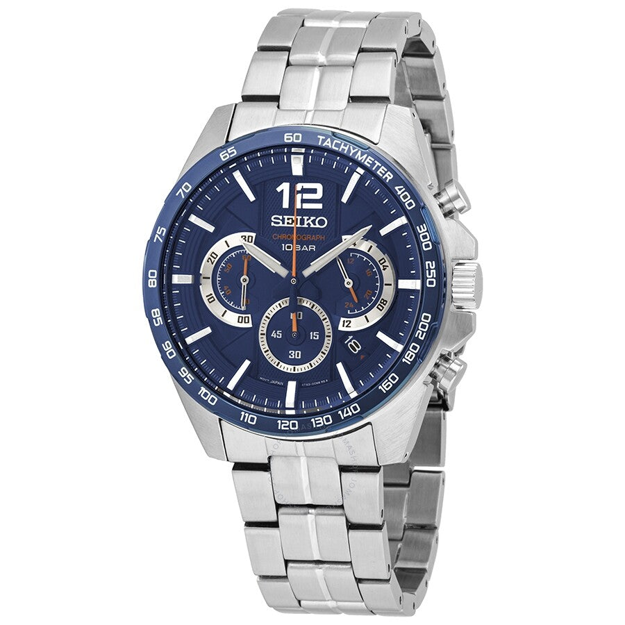 Silver-tone stainless steel case and bracelet. Fixed blue ion-plated stainless steel showing tachymeter markings bezel. Blue dial with luminous silver-tone hands and index hour markers. Arabic numeral appears at the 12 o'clock position. Minute markers around the outer rim. Dial Type: Analog. Luminescent hands and markers. Date display between the 4 and 5 o'clock positions. Chronograph - three sub-dials displaying: 60 second, 30 minute and 12-24 hour. Seiko Caliber 8T63 quartz movement. Scratch resistant Hardlex crystal. Pull / push crown. Solid case back. Round case shape, case size: 43.9 mm, case thickness: 12 mm. Band width: 20 mm. Fold over clasp. Water resistant at 100 meters / 330 feet. Functions: chronograph, tachymeter, date, hour, minute, second. Essentials Series. Sport watch style. Watch label: Japan Movt. Seiko Essentials Chronograph Quartz Blue Dial Men's Watch Ssb345.