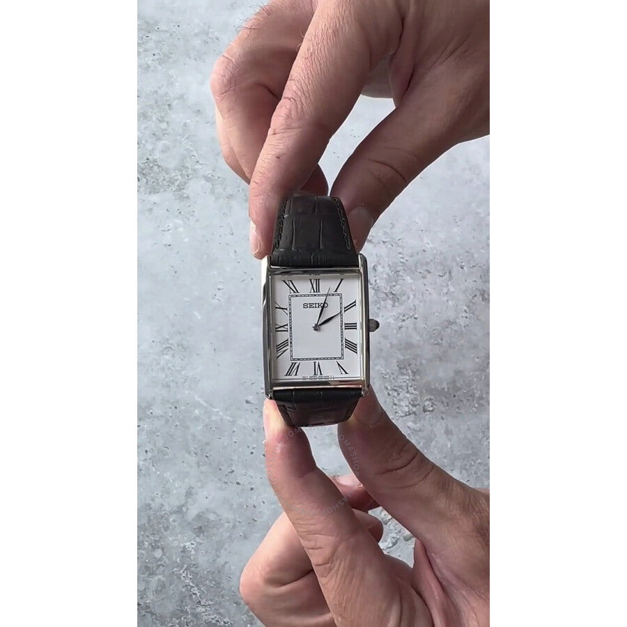 Silver-tone stainless steel case with a black leather strap. Fixed silver-tone stainless steel bezel. White dial with black hands and Roman numeral hour markers. Minute markers around an innwer ring. Dial Type: Analog. Seiko Caliber 4N30 quartz movement. Scratch resistant Hardlex crystal. Pull / push crown. Solid case back. Square case shape, case size: 28.4 mm. Tang clasp. Water resistant at 30 meters / 100 feet. Functions: hour, minute. Essentials Series. Casual watch style. Watch label: Japan Movt. Seiko Essentials Quartz White Dial Black Leather Men's Watch SWR049.
